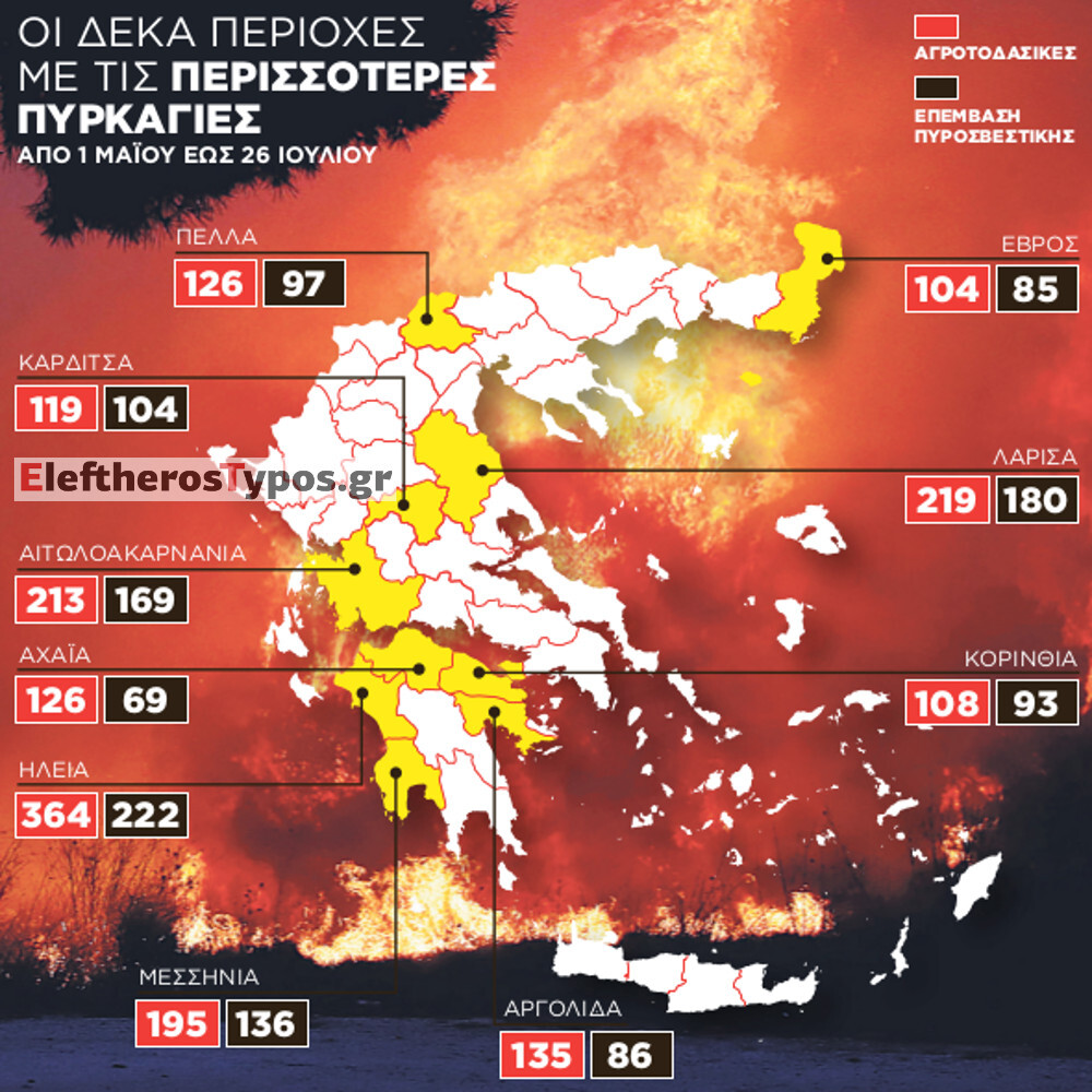 Τις 25 πρώτες ημέρες του Ιουλίου, η Πυροσβεστική ενήργησε σε 1.180 δασικές πυρκαγιές σε όλη τη χώρα. «Εχουμε καταγράψει πυρκαγιές που αφορούν μια κουκίδα ή ένα μόλις στρέμμα και άλλες που έχουν κάψει δεκάδες χιλιάδες», σημειώνουν στελέχη της Πυροσβεστικής. Περισσότερα από 4.290 στρέμματα έγιναν στάχτη στην Πεντέλη μεταξύ των οποίων και αναδασωτέα έκταση. Στις Μέλαμπες Ρεθύμνου, η αποτεφρωμένη περιοχή καλύπτει επιφάνεια της τάξεως των 19.940 στρεμμάτων. Πάνω από 17.000 στρέμματα έκαψε η φωτιά στα Βατερά της Λέσβου, με τις νέες αναζωπυρώσεις όμως να προσθέτουν και άλλες περιοχές στον καταστροφικό απολογισμό. Στη μεγάλη φωτιά στο Σερνικάκι Φωκίδας, σύμφωνα με τις εκτιμήσεις της Πυροσβεστικής, κάηκαν 3.000 στρέμματα αγροτικής έκτασης και περίπου 9.000 στρέμματα χαμηλής βλάστησης, ενώ στα Κρέστενα το πύρινο μέτωπο έκαψε σχεδόν 8.000 στρέμματα.