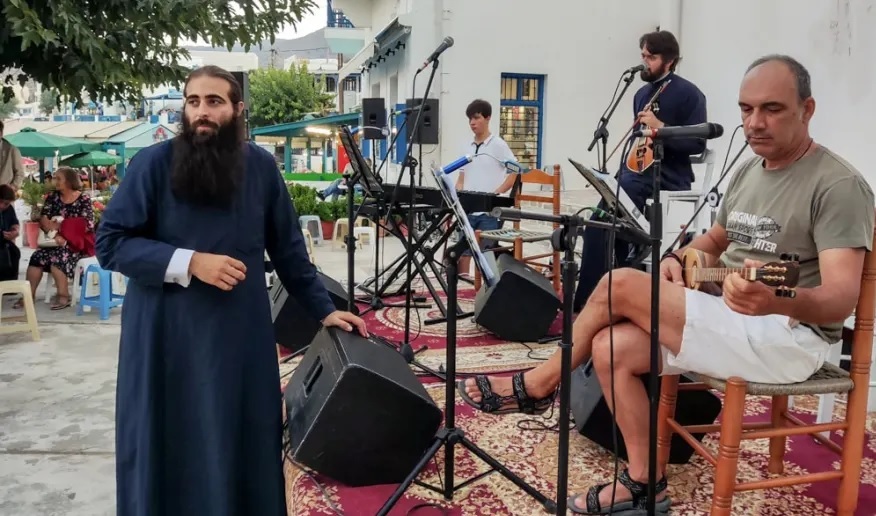 Ο δραστήριος παπάς του Απόλλωνα ανέβηκε στην εξέδρα που είχε στηθεί για συναυλία, πήρε το μικρόφωνο και τραγούδησε έντεχνα και ροκ τραγούδια ενώ «ράπαρε» και το «διθέσιο» της Άλκηστις Πρωτοψάλτη όπου διασκευάζοντάς το προσκάλεσε τον κόσμο στον όμορφο Απόλλωνα της Νάξου… «Μη με πας απ’ το σπίτι, στο νησί να με πας, στον Απόλλωνα της Νάξου και να σε έχω αγκαλιά…».