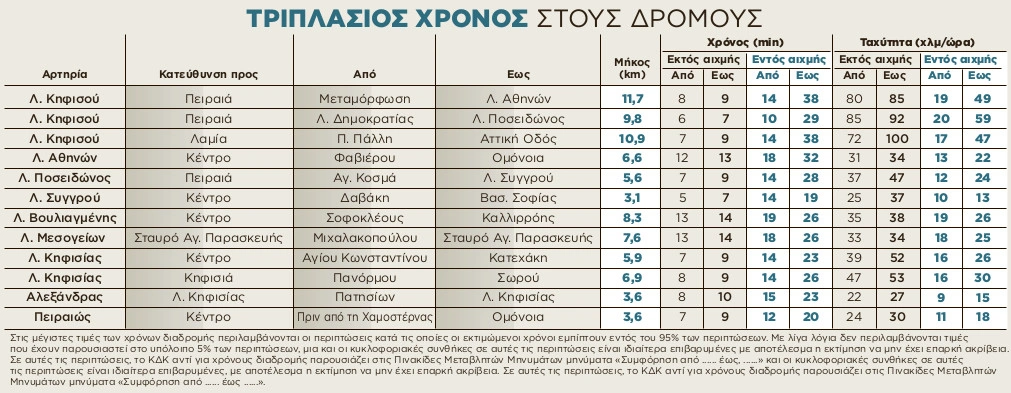 Οπως προκύπτει από στοιχεία που έχει στη διάθεσή του ο «Ελεύθερος Τύπος», στη Λεωφόρο Κηφισού, κατεύθυνση προς Πειραιά, από τη Μεταμόρφωση έως τη Λεωφόρο Αθηνών, μία διαδρομή μήκους 11,7 χλμ. εκτός αιχμής οι οδηγοί την κάνουν σε 8-9 λεπτά, ενώ σε ώρες που η κίνηση είναι στο κόκκινο χρειάζονται έως και 38 λεπτά. Αναπόφευκτα η ταχύτητα από τα περίπου 85 χλμ./ώρα πέφτει στα 19-49 χλμ./ώρα. Από τη Λεωφόρο Δημοκρατίας έως τη Λεωφόρο Ποσειδώνος, μία διαδρομή μήκους 9,8 χλμ., οι οδηγοί εκτός αιχμής χρειάζονται 6-7 λεπτά για να τη διανύσουν, ενώ όταν έχει κίνηση μπορεί να χρειαστούν έως και 29 λεπτά. Η ταχύτητα και σε αυτήν την περίπτωση πέφτει από τα περίπου 90, στα 20-59 χλμ./ώρα.