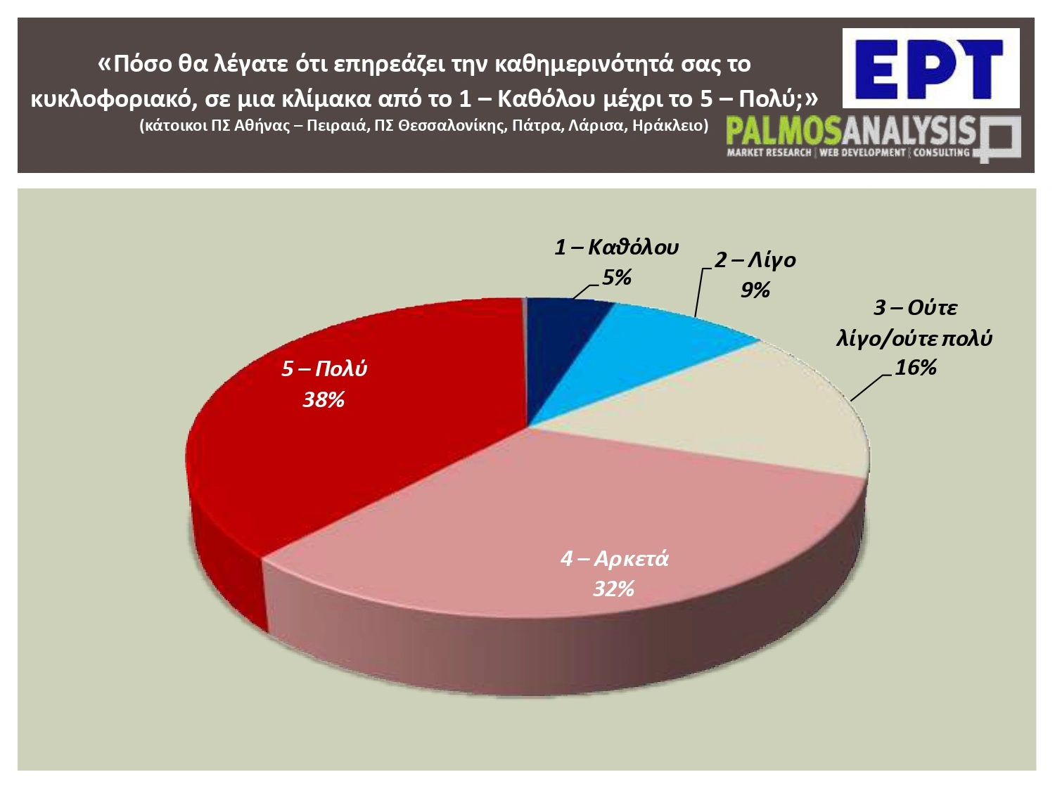 - 7 στους 10 κατοίκους των μεγάλων αστικών κέντρων της χώρας (70%) θεωρούν το κυκλοφοριακό «Πολύ» (38%) ή «Αρκετά» (32%) σημαντικό πρόβλημα για την καθημερινότητά τους. Μεγάλο πρόβλημα θεωρείται και η στάθμευση, καθώς περίπου 9 στους 10 (87%) δηλώνουν ότι το πρόβλημα της στάθμευσης στην πόλη τους είναι «Πολύ» (67%) ή «Αρκετά» (20%) σημαντικό.