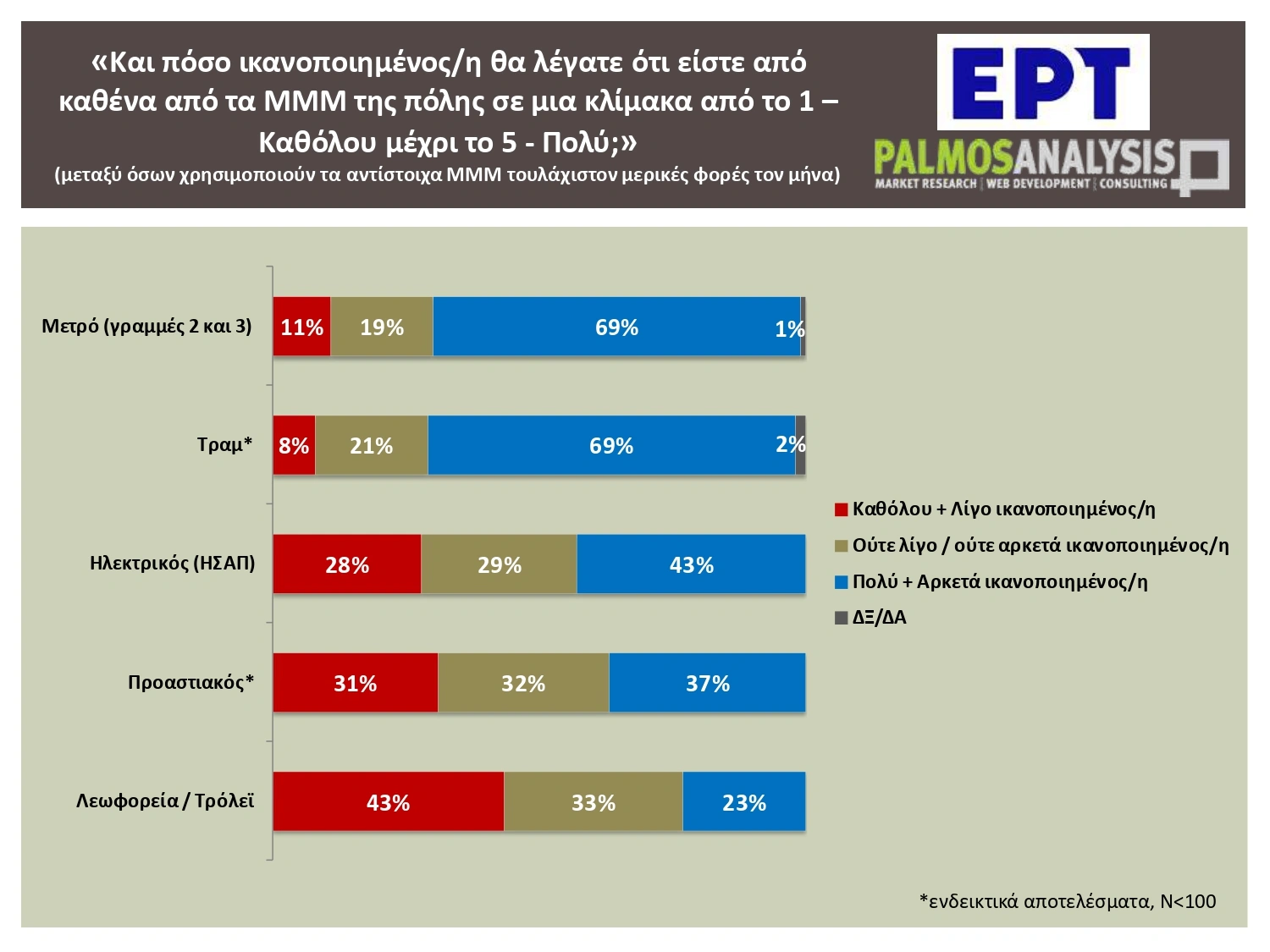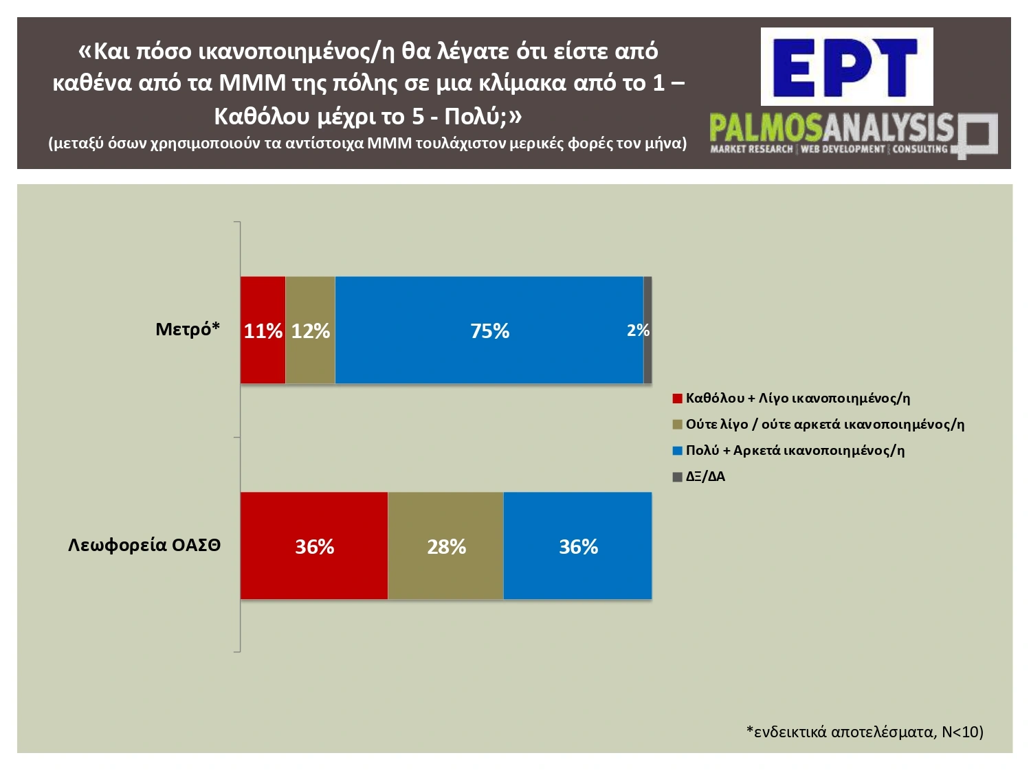 - Υψηλή ικανοποίηση προκύπτει για το Μετρό, καθώς δηλώνουν «Πολύ» ή «Αρκετά» ικανοποιημένοι το 69% των χρηστών του. Θετικό ισοζύγιο ικανοποίησης προκύπτει για τον Ηλεκτρικό (ΗΣΑΠ), αλλά σε σαφώς μικρότερο βαθμό (43% «Πολύ» ή «Αρκετά» ικανοποιημένοι), ενώ οι χρήστες Λεωφορείων/Τρόλεϊ δηλώνουν «Λίγο» ή «Καθόλου» ικανοποιημένοι σε ποσοστό 43% έναντι μόλις 23% που δηλώνουν «Πολύ» ή «Αρκετά» ικανοποιημένοι.