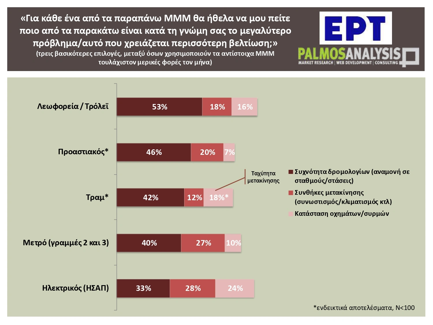 - Η αύξηση της συχνότητας των δρομολογίων και η μείωση του χρόνου αναμονής σε στάσεις/σταθμούς είναι το βασικότερο αίτημα των χρηστών όλων των ΜΜΜ (53% στους χρήστες των Λεωφορείων/Τρόλεϊ, 46% στους χρήστες του Προαστιακού, 42% στους χρήστες του Τραμ, 40% στους χρήστες του Μετρό και 33% στους χρήστες του Ηλεκτρικού (ΗΣΑΠ).