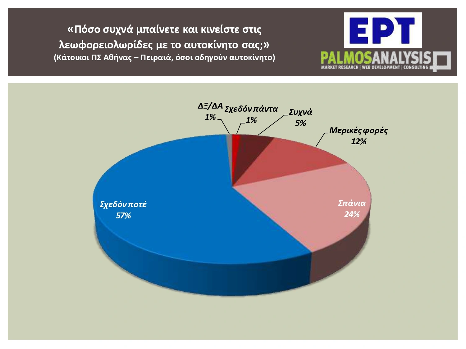 Παρά τη διαπίστωση του προβλήματος, το 60% των εργαζομένων στο Πολεοδομικό Συγκρότημα Αθήνα-Πειραιά χρησιμοποιούν για τις μετακινήσεις τους ΙΧ, ταξί ή δίκυκλο, αντί για κάποιο από τα ΜΜΜ, ενώ το 42% των οδηγών στις ίδιες πόλεις επιμένουν να μπαίνουν στις λεωφορειολωρίδες (41% σε Θεσσαλονίκη).
