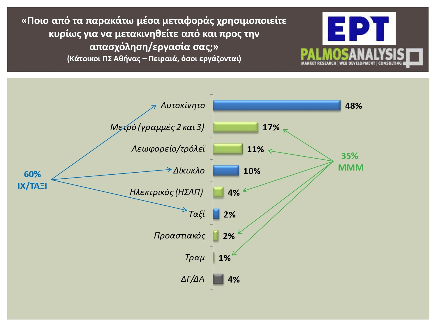 - Αθροιστικά, το 60% των εργαζομένων επιλέγουν να μετακινηθούν από και προς την εργασία τους με αυτοκίνητο ή ταξί ή δίκυκλο. Τα Μέσα Μαζικής Μεταφοράς (ΜΜΜ) επιλέγουν για την μετακίνησή τους το 35% των εργαζομένων αθροιστικά.