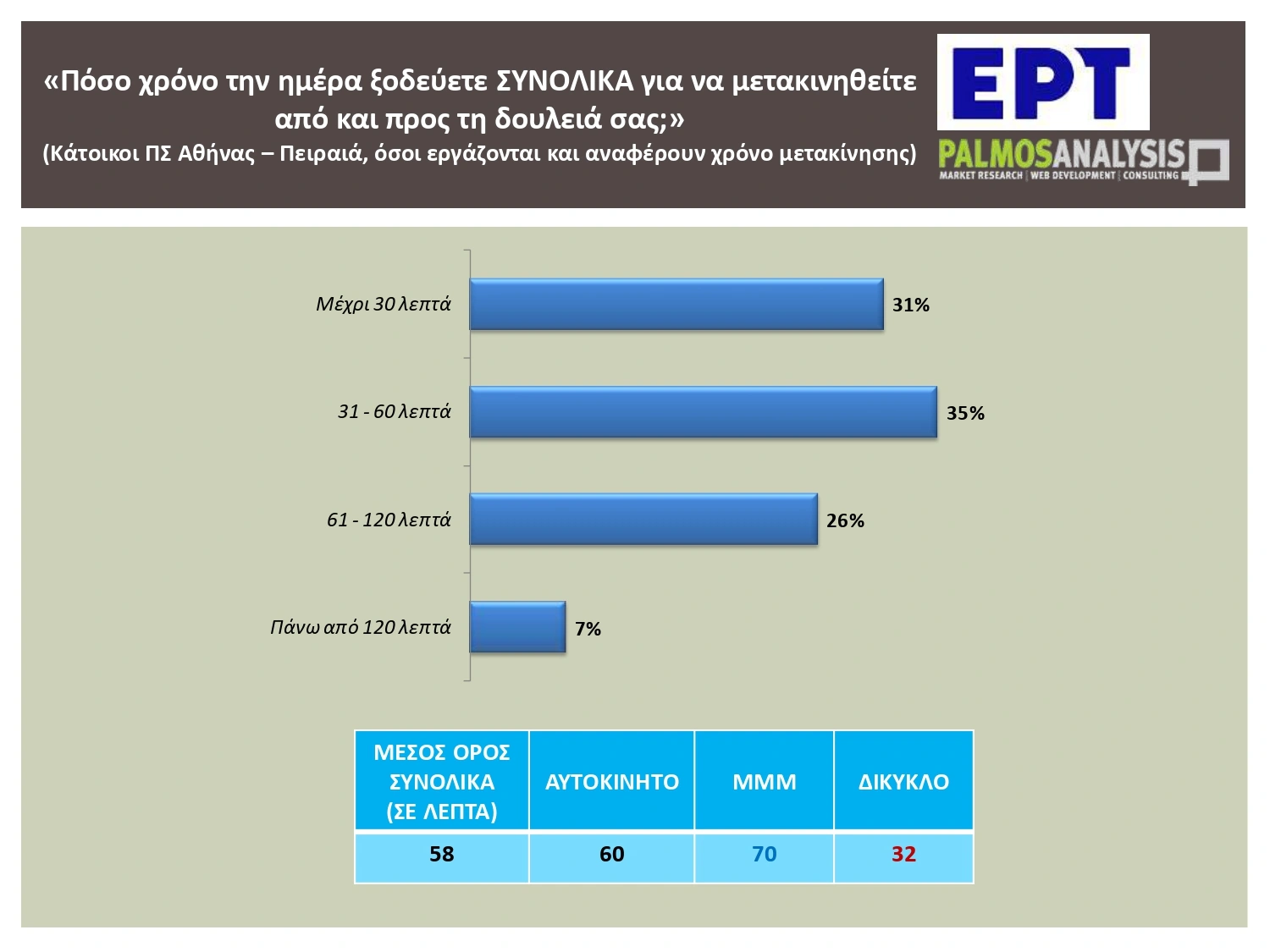 - Περίπου μία ώρα την ημέρα κατά μέσο όρο (58 λεπτά) ξοδεύουν καθημερινά οι εργαζόμενοι στο ΠΣ Αθήνας – Πειραιά για την μετακίνησή τους από και προς την εργασία τους.