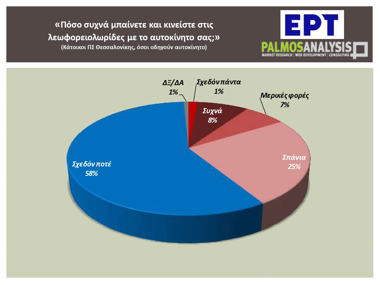 - Το 38% των κατοίκων του Πολεοδομικού Συγκροτήματος Θεσσαλονίκης δηλώνουν ότι χρησιμοποιούν το Μετρό της πόλης τουλάχιστον μερικές φορές τον μήνα και το 6% δηλώνουν ότι το χρησιμοποιούν καθημερινά. Αντίστοιχα, το 52% αναφέρουν ότι χρησιμοποιούν λεωφορεία ή τρόλεϊ τουλάχιστον μερικές φορές τον μήνα (το 13% αναφέρουν καθημερινή χρήση).