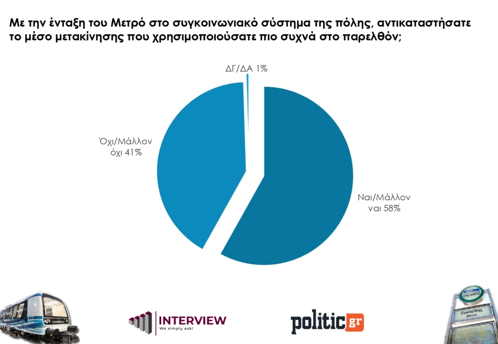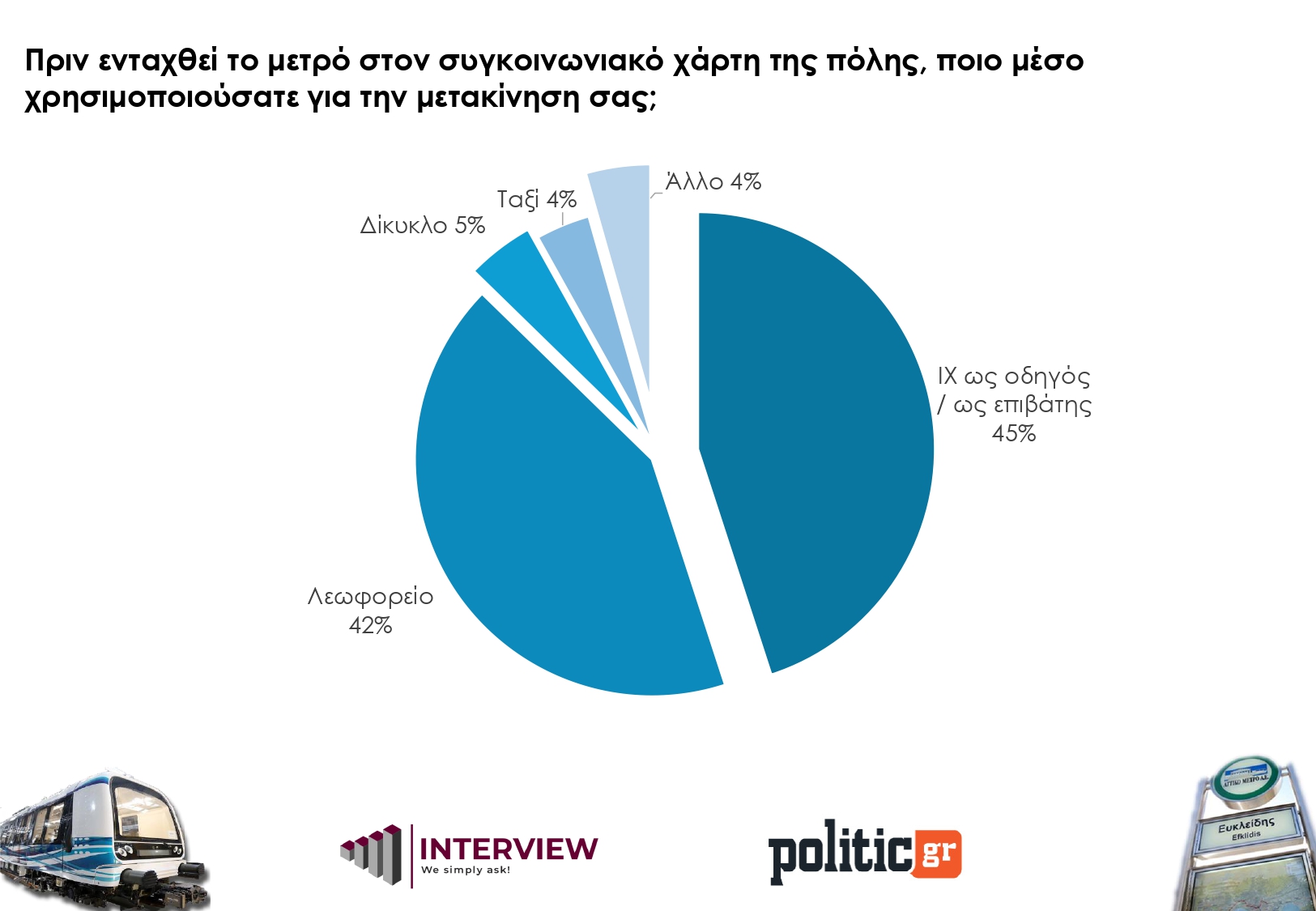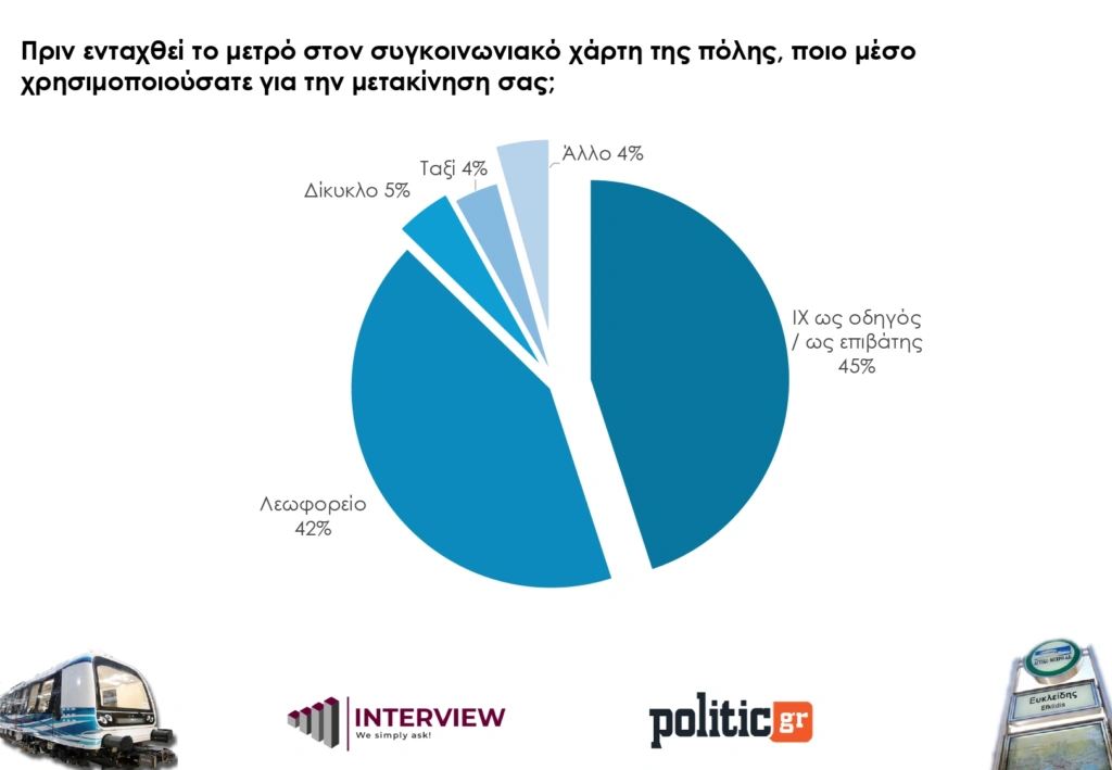 Παράλληλα, ένας στους δύο (58%) δήλωσε ότι αντικατέστησε το προηγούμενο μέσο μεταφοράς του με το Μετρό, δείγμα της δυναμικής του νέου συγκοινωνιακού μέσου. Πριν τη λειτουργία του Μετρό οι πολίτες λένε ότι χρησιμοποιούσαν κυρίως τα ΙΧ και τα λεωφορεία για τις μετακινήσεις τους.