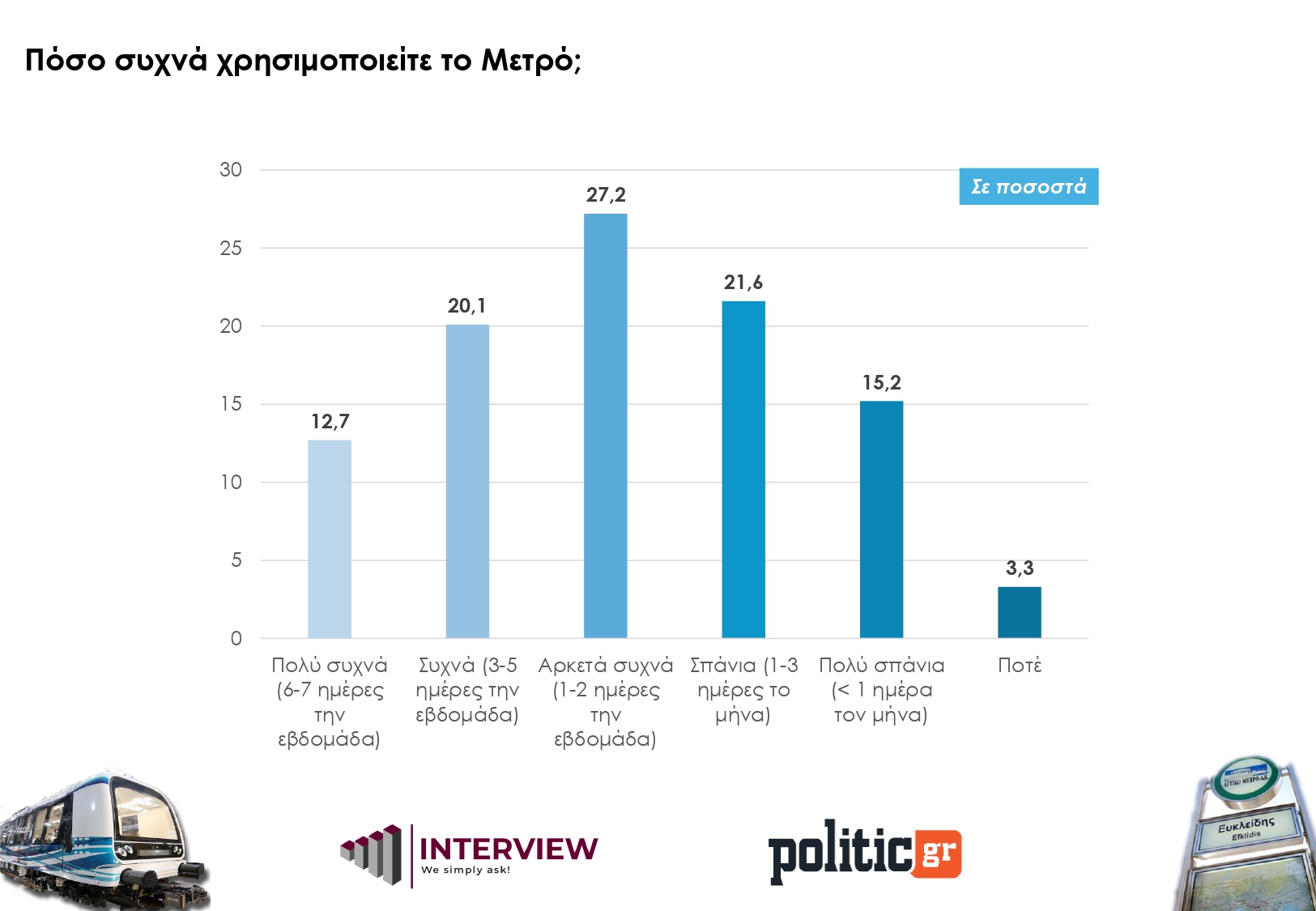 Η χρήση του μέσου είναι κυρίως περιστασιακή, με το 27,2% να δηλώνει ότι χρησιμοποιεί το Μετρό 1-2 φορές την εβδομάδα.
