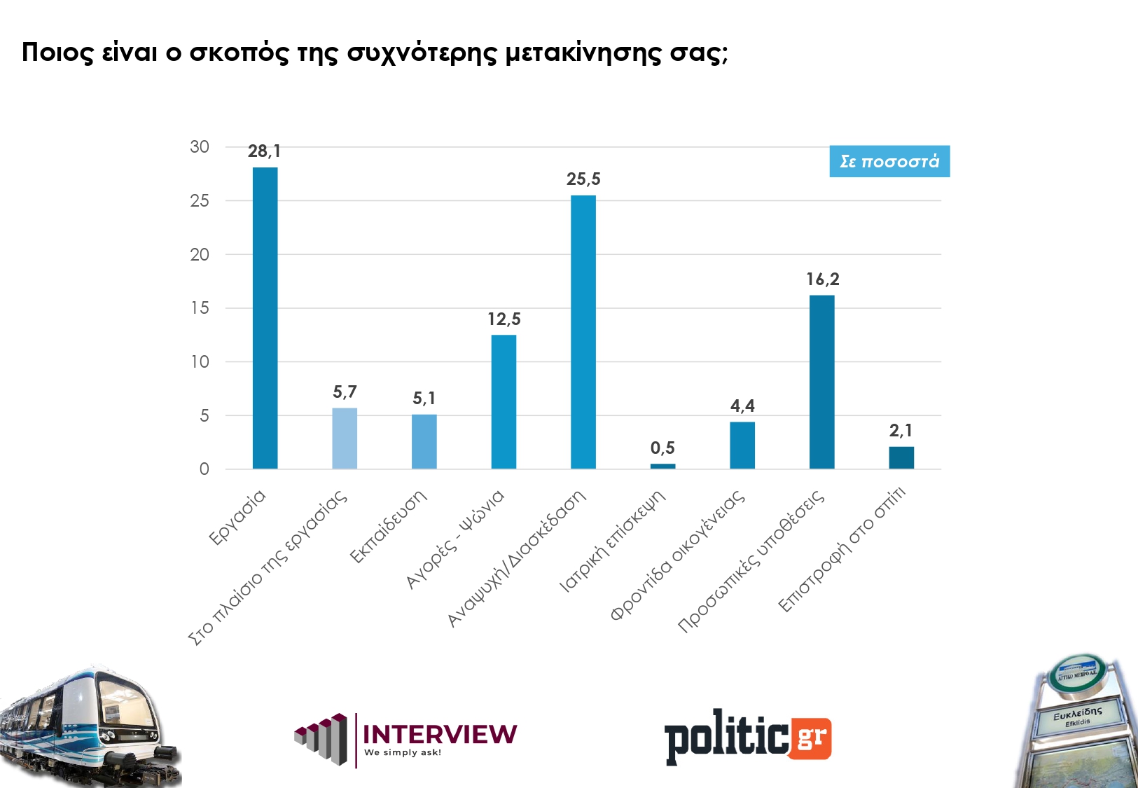 Η πλειοψηφία (28,1%) των επιβατών το χρησιμοποιούν για να μεταβούν στην εργασία τους. Το 25,5% επιλέγει το Μετρό για ψυχαγωγία και κοινωνικές δραστηριότητες, ενώ το 16,2% για προσωπικές υποθέσεις.