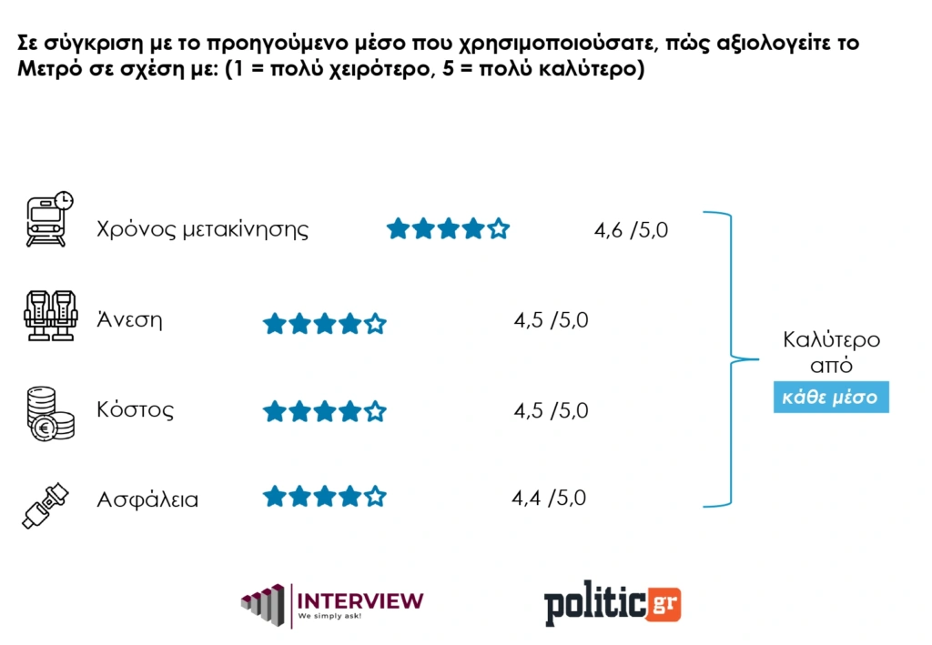 Οι επιβάτες αξιολογούν θετικά τη νέα υποδομή, συγκρίνοντάς την με τα προηγούμενα μέσα μεταφοράς που χρησιμοποιούσαν. Το Μετρό θεωρείται ταχύτερο, πιο άνετο, ασφαλές και οικονομικό σε σύγκριση με τα υπόλοιπα μέσα μαζικής μεταφοράς, ωστόσο η χαμηλή αξιολόγηση της ευκολίας χρήσης των εισιτηρίων (3,0/5,0) αποτελεί μια σαφή ένδειξη ότι οι επιβάτες αντιμετωπίζουν δυσκολίες είτε στη διαδικασία έκδοσης, είτε στην επικύρωση και χρήση των εισιτηρίων.
