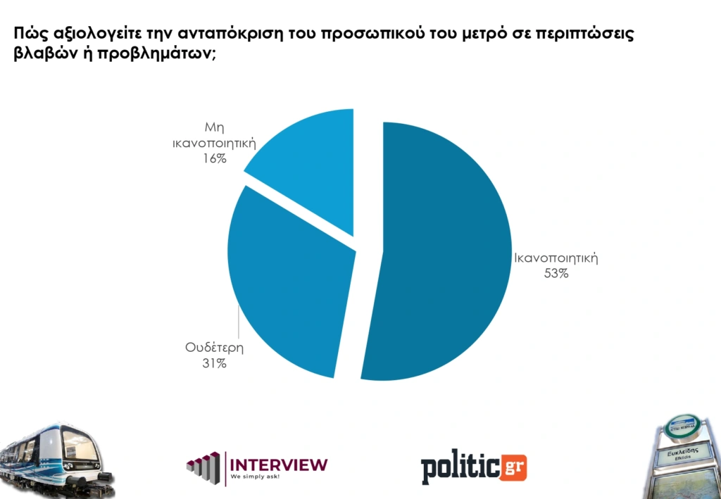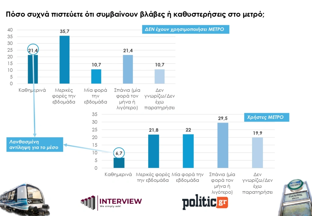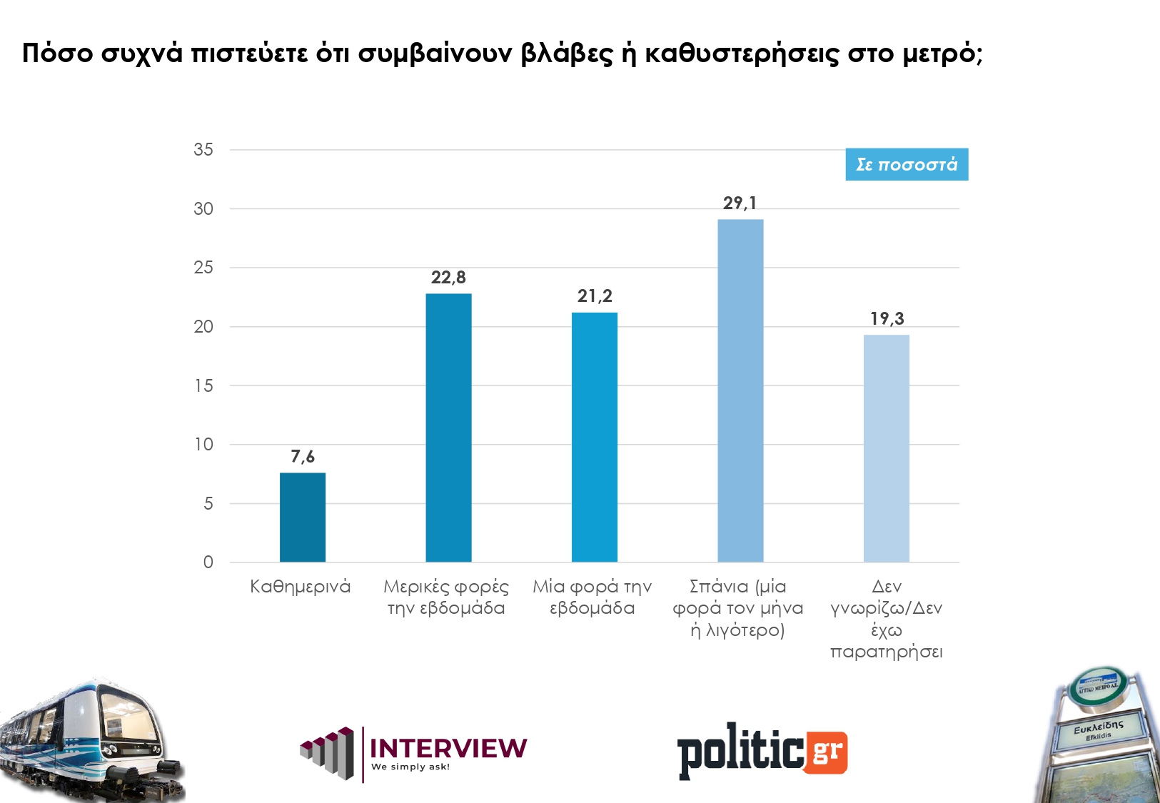 Όσον αφορά τη συχνότητα στις βλάβες και καθυστερήσεις, η πλειοψηφία (29%) λέει ότι είναι σπάνιες (μία φορά το μήνα), από κοντά το 22,8% λέει μερικές φορές την εβδομάδα και το 21,2% μία φορά την εβδομάδα.