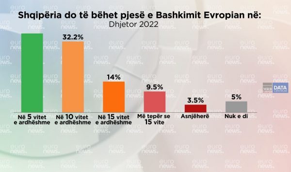 Αυξήθηκε επίσης το ποσοστό των Αλβανών που πιστεύουν ότι η χώρα τους θα ενταχθεί στην ΕΕ είτε μέσα στα επόμενα 10 χρόνια (από 29,3% το 2021 σε 32,2%) και μειώθηκε το ποσοστό εκείνων που θεωρούν ότι για την ένταξη θα χρειαστούν περισσότερα από 15 χρόνια (από 14,1% το 2021 στο 9,5% το 2022).