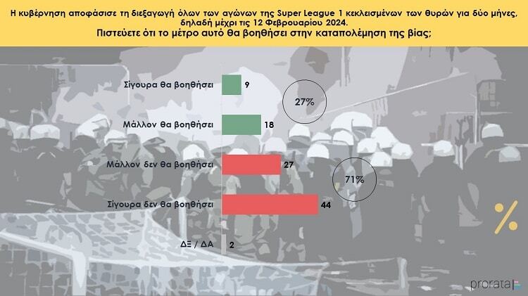 Σε έρευνα που πραγματοποίησε η PRORATA αμέσως μετά την ανακοίνωση των μέτρων η πλειοψηφία της κοινής γνώμης σε ποσοστό 71% εκτιμά ότι τα μέτρα δεν θα βοηθήσουν στην καταπολέμιση της βίας