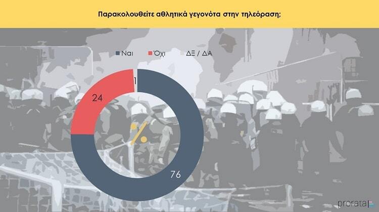 Διαφορετική είναι η εικόνα αναφορικά με την παρακολούθηση αθλητικών γεγονότων στην τηλεόραση, καθώς το 76% της κοινής γνώμης δηλώνει ότι παρακολουθεί κάποιο.