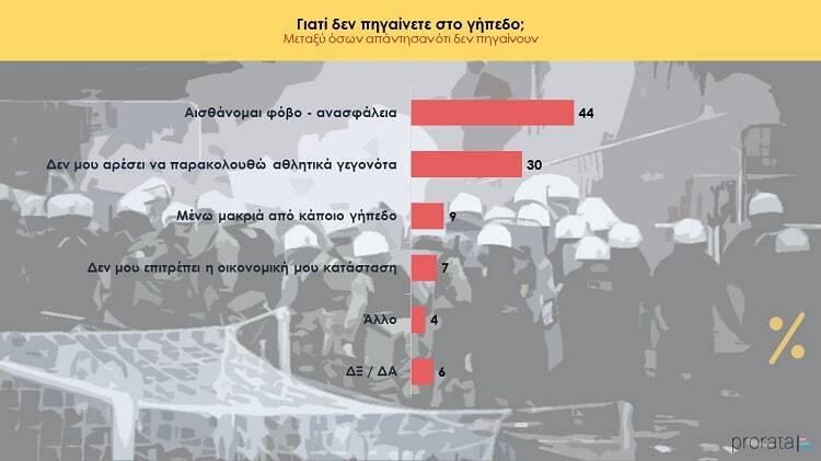 Αξιοσημείωτο είναι ότι ο κύριος λόγος που δεν πηγαίνουν στο γήπεδο είναι γιατί αισθάνονται φόβο-ανασφάλεια (44%).