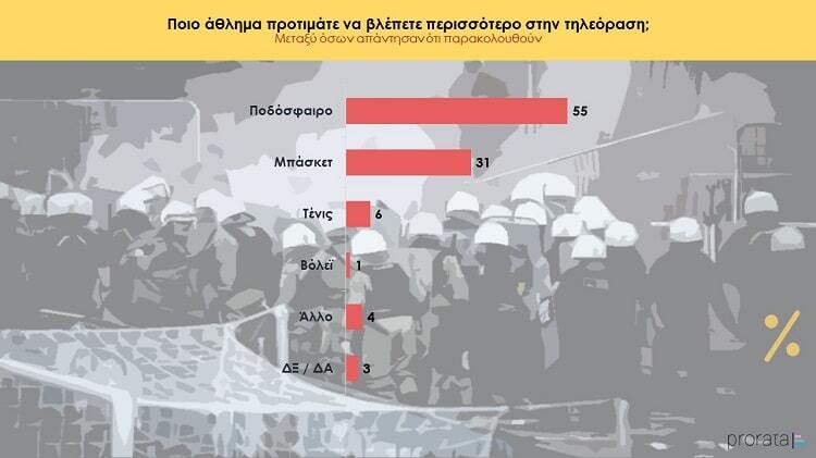 Από αυτούς, λίγο παραπάνω από τους μισούς (55%) δηλώνουν ότι βλέπουν περισσότερο ποδόσφαιρο, το 31% ότι βλέπει πιο πολύ μπάσκετ, το 6% τένις, το 1% βόλεϊ και ένα 4% κάποιο άλλο άθλημα.