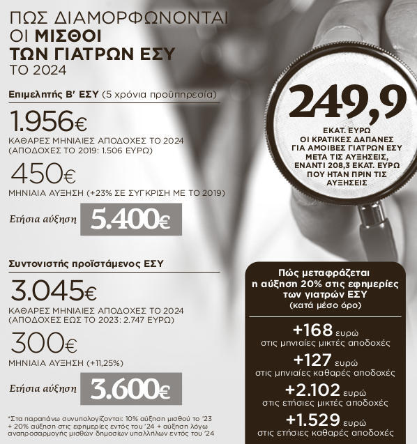 Να σημειωθεί πως η αύξηση στην εφημεριακή απασχόληση των γιατρών από τον Ιανουάριο του 2024 θα κοστίσει στο κράτος πάνω από 40 εκατ. ευρώ, ενώ στον Προϋπολογισμό του ’24 υπάρχει και πρόβλεψη 20 εκατομμυρίων για τον τριπλασιασμό των οικονομικών κινήτρων σε γιατρούς που αναμένεται να υπηρετήσουν σε άγονες περιοχές της ηπειρωτικής και νησιωτικής Ελλάδας, όπως στην Κω, την Ξάνθη και τη Λέρο.