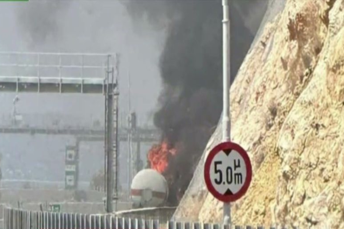 Σε φωτογραφία που αναρτήθηκε νωρίτερα στο Twitter διακρίνεται το βυτιοφόρο το οποίο έχει παραδοθεί στις φλόγες, ενώ βγαίνουν μαύροι καπνοί.
