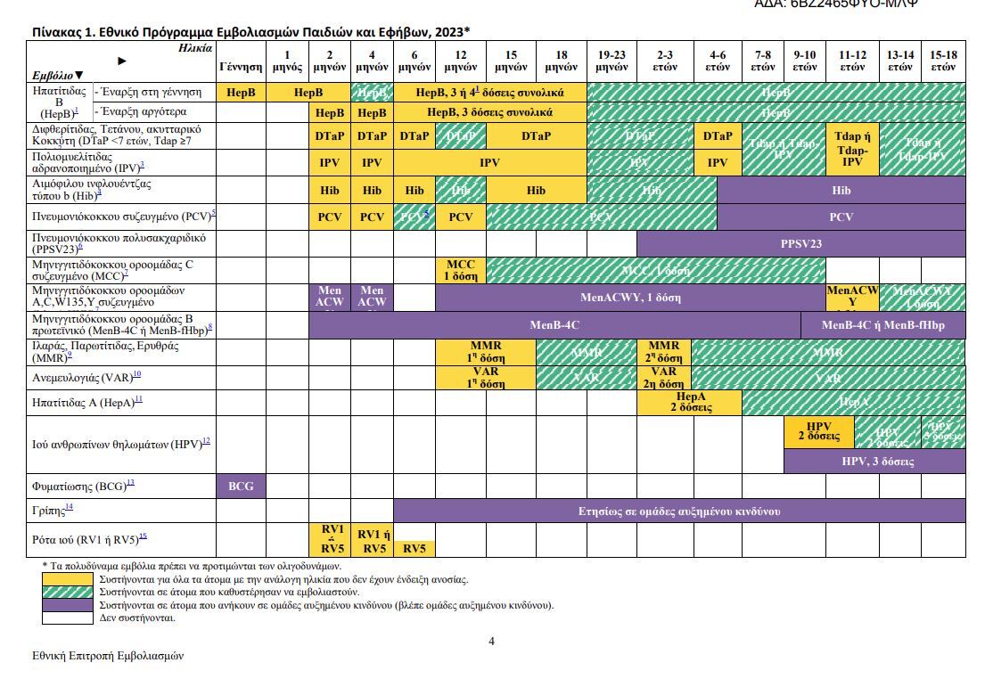 Το νέο πρόγραμμα περιλαμβάνει τις συστάσεις για βρέφη από 4 μηνών έως 18 ετών, ενώ σε ξεχωριστή κατηγορία παρατίθενται οι εμβολιασμοί των ενηλίκων.