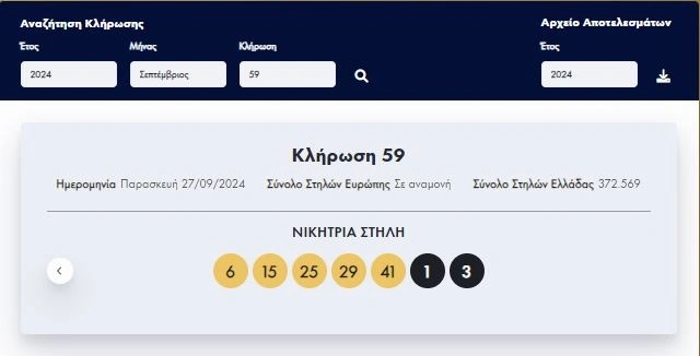 Οι τυχεροί αριθμοί, που ανέδειξε η κληρωτίδα της αποψινής κλήρωσης, είναι οι εξής: 6, 15, 25, 29, 41 και αριθμοί Eurojackpot 1 και 3.