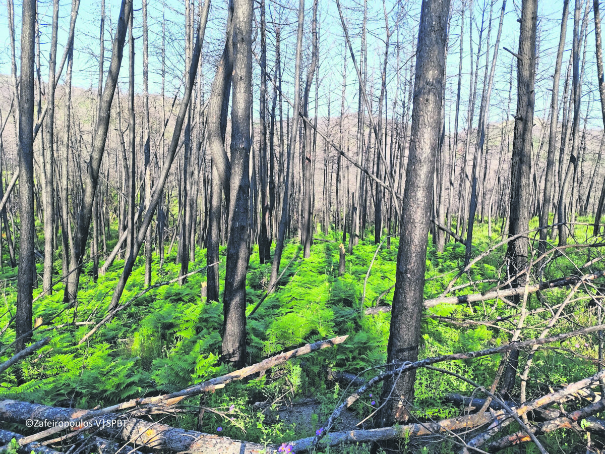 Σε αυτή τη φάση δεν είναι εφικτή η διάκριση νεαρών ατόμων τραχείας πεύκης από μαύρη πεύκη, γεγονός που περιορίζει την εξαγωγή συμπερασμάτων σε μικτές θέσεις. Τα υπόλοιπα δασικά είδη παρουσιάζουν επίσης θετική εικόνα. Στις θέσεις χαμηλής και μέτριας δριμύτητας καύσης καταγράφηκε έντονη αναβλάστηση από ρείκια, βελανιδιές και φιλύκια, ενώ η λαδανιά εμφανίζεται με μεγάλη πυκνότητα από φύτρωση σπερμάτων. Τα ρείκια φαίνεται να ευνοούν τη φυσική αναγέννηση των πεύκων, ενώ οι λαδανιές λειτουργούν ανταγωνιστικά. Η ανάπτυξη των ειδών βελανιδιάς είναι ιδιαίτερα δυναμική, όπως και όλων των ειδών που αναβλαστάνουν.