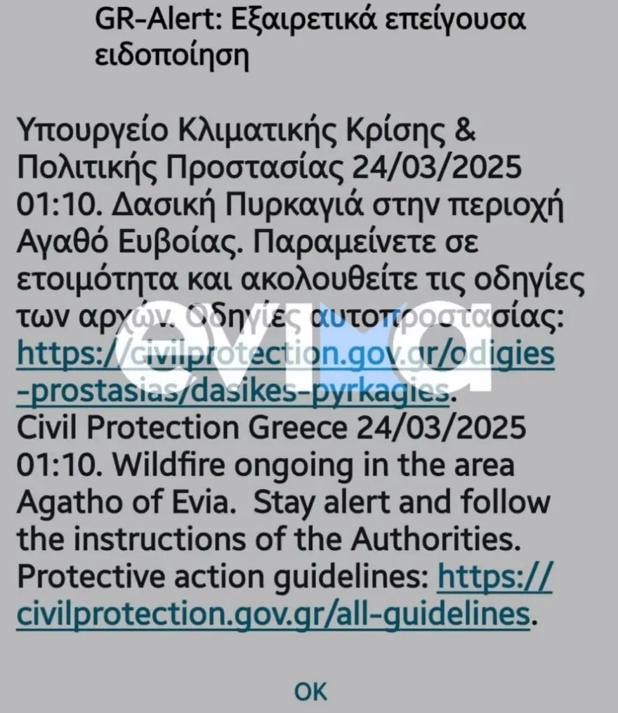 Δέκα λεπτά μετά τη μία τα μεσάνυχτα εστάλη και μήνυμα του 112 προς τους κατοίκους της περιοχής Αγαθό Ευβοίας που τους ενημέρωνε για την πυρκαγιά και τους καλούσε να βρίσκονται σε ετοιμότητα και να ακολουθούν τις οδηγίες των Αρχών.