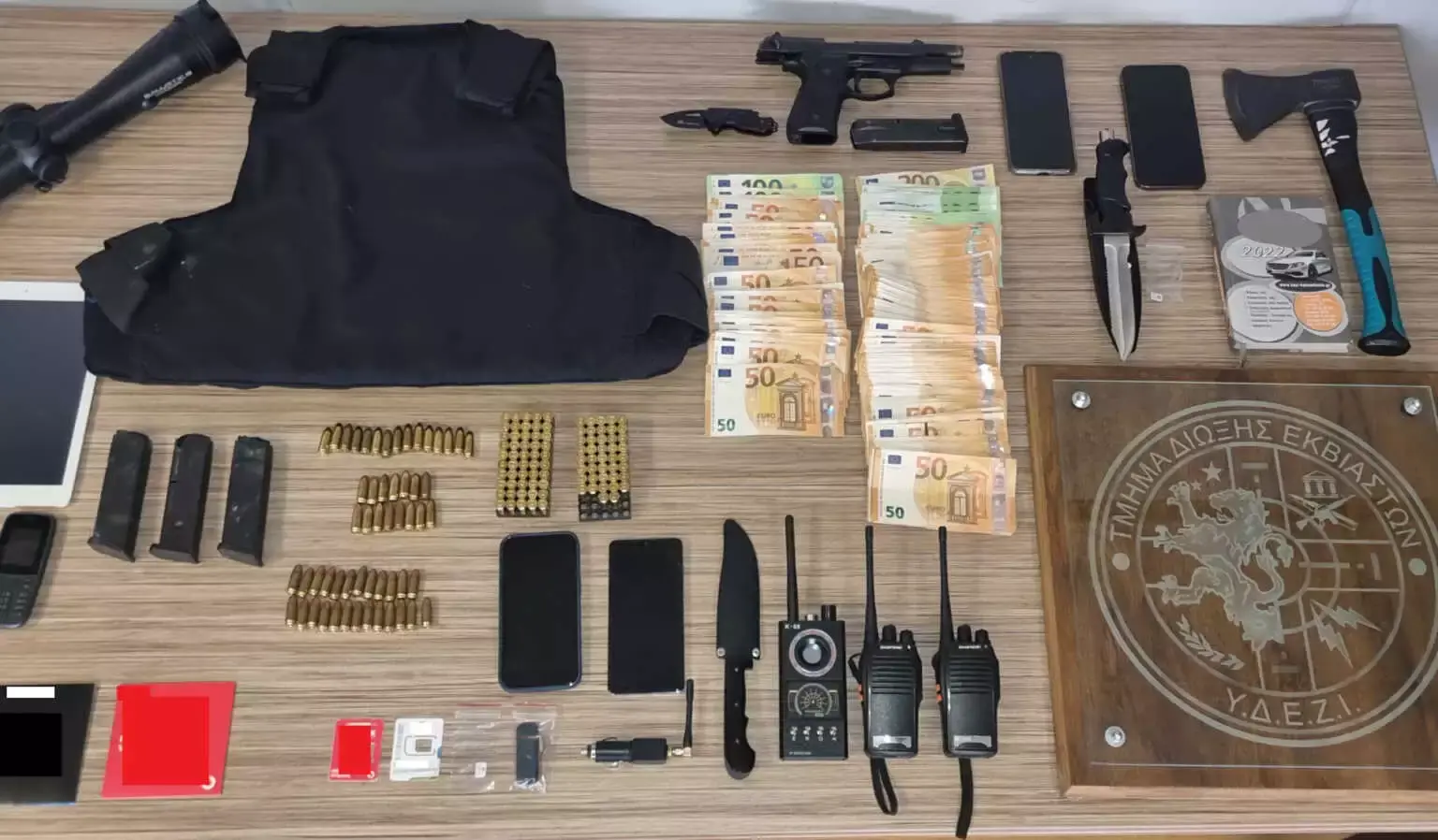 Σε έρευνες που πραγματοποιήθηκαν βρέθηκαν και κατασχέθηκαν στην κατοχή του 42χρονου συλληφθέντα: πιστόλι με υποδοχή για σιγαστήρα και γεμιστήρα με 14 φυσίγγια κα φυσίγγιο στην θαλάμη του, 132 φυσίγγια, 3 γεμιστήρες πιστολιού, 2 μαχαίρια, τσεκούρι, ηλεκτρονική συσκευή παρεμβολής σήματος (gps blocker), ανιχνευτής ηλεκτρονικών συσκευών -κοριών παρακολούθησης, αλεξίσφαιρο γιλέκο, διόπτρα μακρύκανου όπλου, 2 φορητοί ασύρματοι και ένα tablet, 6 κινητά τηλέφωνα, 3 πακέτα τηλεφωνικών συνδέσεων, στέλεχος και κάρτα sim, 2 κάρτες μνήμης, usb stick, όχημα ιδιοκτησίας του, που χρησιμοποιήθηκε για την τέλεση των παραπάνω δράσεων καθώς και το χρηματικό ποσό των 10.750 ευρώ.