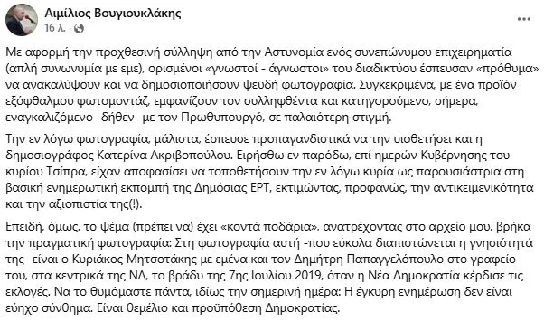«Με αφορμή την προχθεσινή σύλληψη από την Αστυνομία ενός συνεπώνυμου επιχειρηματία (απλή συνωνυμία με εμε), ορισμένοι «γνωστοί – άγνωστοι» του διαδικτύου έσπευσαν «πρόθυμα» να ανακαλύψουν και να δημοσιοποιήσουν ψευδή φωτογραφία. Συγκεκριμένα, με ένα προϊόν εξόφθαλμου φωτομοντάζ, εμφανίζουν τον συλληφθέντα και κατηγορούμενο, σήμερα, εναγκαλιζόμενο -δήθεν- με τον Πρωθυπουργό, σε παλαιότερη στιγμή.