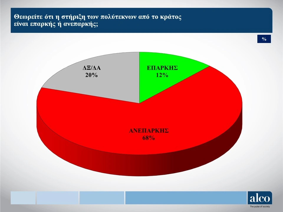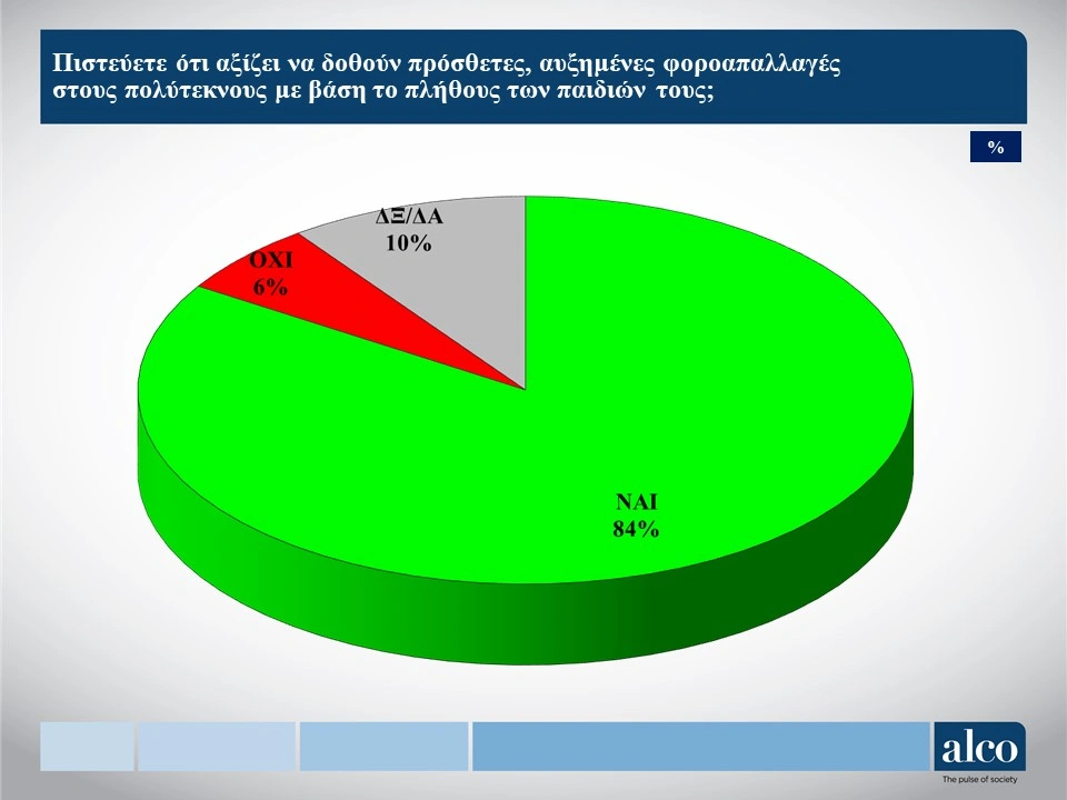 Την ίδια ώρα, το 68% εκτιμά πως, η στήριξη των πολυτέκνων από το κράτος είναι ανεπαρκής, καθώς οι πολύτεκνες οικογένειες ταλαιπωρούνται περισσότερο από κάθε άλλη κοινωνική ομάδα, από τις αλλεπάλληλες περιόδους κρίσεων που βιώνουμε εδώ και δύο δεκαετίες. Την έρευνα κοινής γνώμης πραγματοποίησε η εταιρεία ALCO, σε δείγμα 1.001 ατόμων ηλικίας 17 ετών και άνω σε όλη τη χώρα στα μέσα Ιουνίου, με στόχο να καταγράψει τις απόψεις των πολιτών για τις πολύτεκνες οικογένειες της χώρας μας. Είναι χαρακτηριστικό πως, το 84% της κοινής γνώμης, εκτιμά πως πρέπει να υπάρξουν πρόσθετες αυξημένες φοροαπαλλαγές στους πολύτεκνους, με βάση το πλήθος των παιδιών τους.