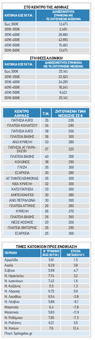 Η εικόνα είναι παρόμοια σε Αθήνα, Θεσσαλονίκη, Πάτρα και Λάρισα, όπου υπάρχουν αρκετά μικρά «φοιτητικά» διαμερίσματα, αλλά για τις χαμηλότερες τιμές θα ζητηθούν παραχωρήσεις, όπως η μεγαλύτερη απόσταση από τις σχολές, η δυσκολότερη πρόσβαση στο δίκτυο συγκοινωνιών, η παλαιότητα του ακινήτου (με ό,τι αυτό σημαίνει για μόνωση και άνεση), ενώ δεν είναι λίγες οι περιπτώσεις όπου ιδιοκτήτες έχουν ζητήσει υψηλές προκαταβολές ως εγγύηση για τη σύναψη μισθωτηρίου, κάνοντας το αρχικό κόστος ενοικίασης δυσβάσταχτο για πολλές οικογένειες.