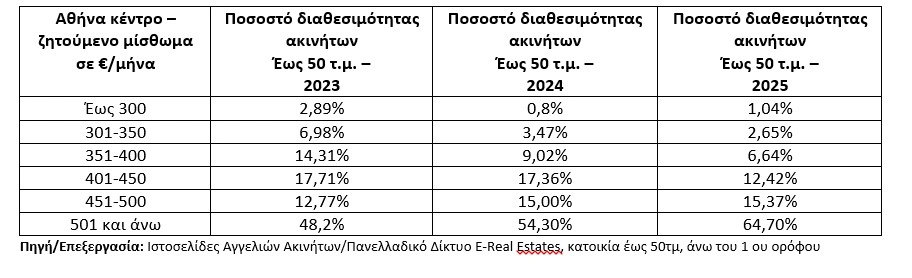 Σύμφωνα με τα δεδομένα που προκύπτουν από τους παρακάτω πίνακες , ο ενδιαφερόμενος φοιτητής που θα επιλέξει να αναζητήσει κατοικία στο κέντρο της Αθήνας, θα πρέπει να γνωρίζει ότι τη φετινή χρονιά το 92,49% (86,66% το 2024), δηλαδή, σχεδόν 9 στις 10 κατοικίες έως 50τμ, έχουν ζητούμενο μίσθωμα άνω των 400€. Αξίζει να αναφερθεί, ότι τη φετινή χρονιά, 7 στις 10 κατοικίες έχουν ζητούμενο μίσθωμα άνω των 501€/μήνα, όταν το 2022 ήταν μόλις 3 στις 10 κατοικίες. Ανάλογα με το ζητούμενο μίσθωμα και τη περιοχή, το ακίνητο ενδέχεται να είναι μερικώς ή/και ολικώς ανακαινισμένο.