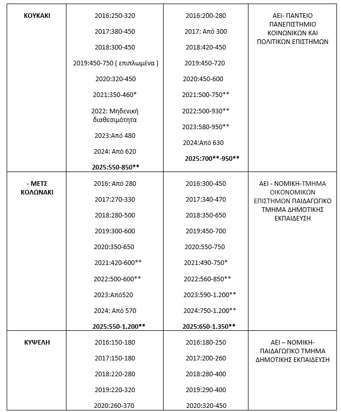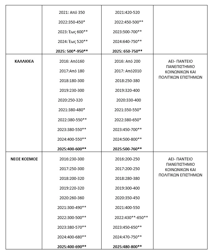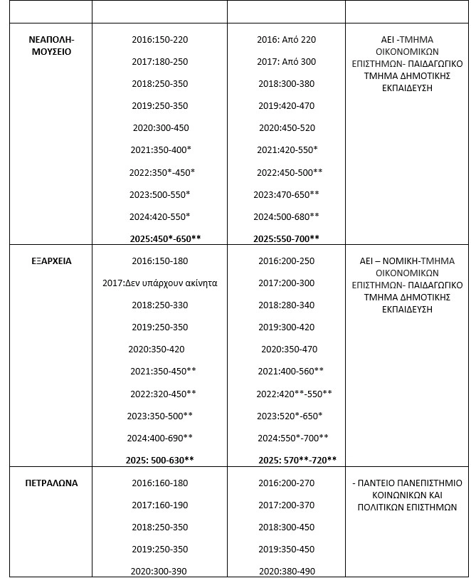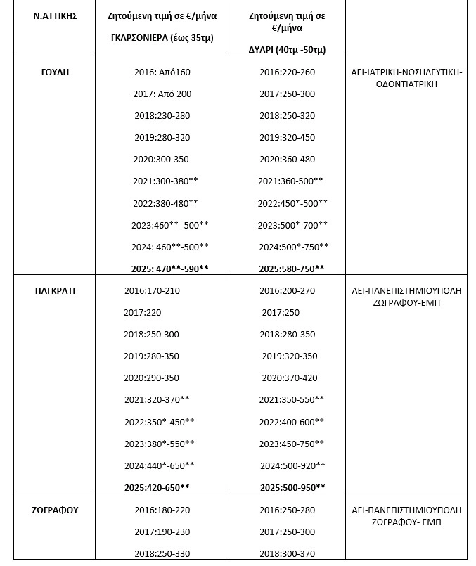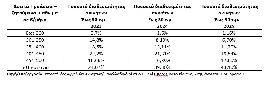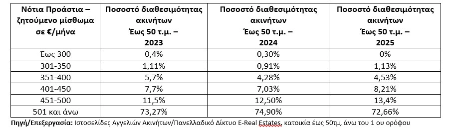 Επιπλέον, την ίδια χρονική στιγμή, η διαθεσιμότητα φοιτητικών κατοικιών με ζητούμενο μίσθωμα έως 300€, ήταν 1,04% (0,8% το 2024, 2,89% το 2023, 10% το 2022). Τη φετινή χρονιά, σύμφωνα με τα μέχρι τώρα δεδομένα που προκύπτουν από τις αναρτημένες αγγελίες ακινήτων σε ιστοσελίδες, η αναζήτηση φοιτητικής κατοικίας άνω του 1ου ορόφου έως 50τμ με ζητούμενο μίσθωμα έως 300€ στην Αθήνα και ιδιαίτερα στις φοιτητικές περιοχές καταγράφεται μηδενική.