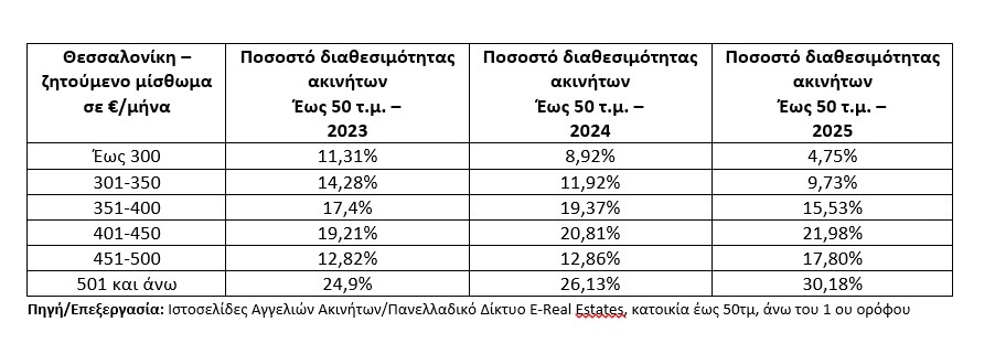 Σύμφωνα με τα δεδομένα που προκύπτουν από τους παρακάτω πίνακες , ο ενδιαφερόμενος φοιτητής που θα επιλέξει να αναζητήσει κατοικία στις περιοχές του κέντρου της Θεσσαλονίκης, θα πρέπει να γνωρίζει ότι τη φετινή χρονιά το 69,96% (59,8% το 2024), δηλαδή, σχεδόν 7στις 10 κατοικίες έως 50τμ, έχουν ζητούμενο μίσθωμα άνω των 400€, εκ των οποίων οι 3 άνω των 501€.