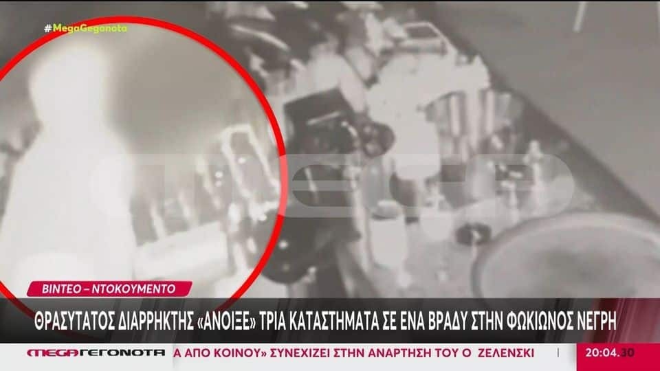 Όπως φαίνεται στα πλάνα που εξασφάλισε το MEGA σε ένα κατάστημα τα ξημερώματα ο νεαρός πηδά στον εξωτερικό χώρο, πλησιάζει την πόρτα του μαγαζιού και με το σφυρί στο χέρι καταφέρνει να την παραβιάσει.