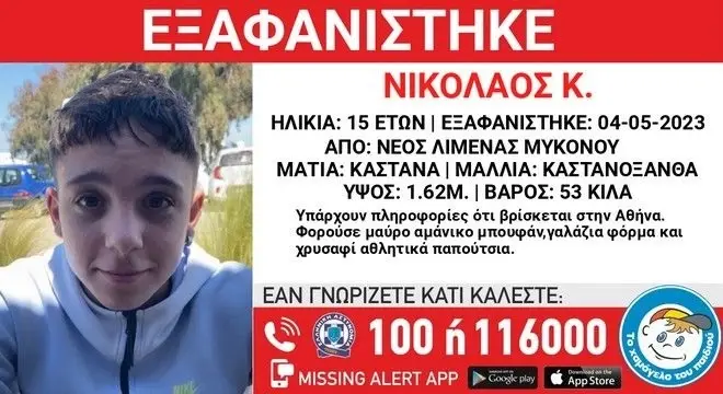 Στο μεταξύ, συναγερμός σήμανε στις αρχές για την εξαφάνιση του 15χρονου, τα ίχνη του οποίου εξαφανίστηκαν στις 4 Μαΐου από τον Νέο Λιμένα Μυκόνου.