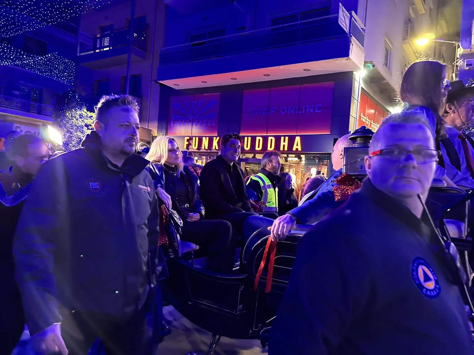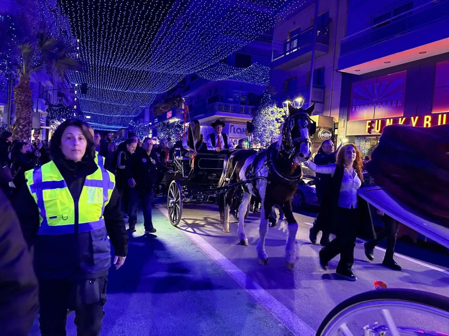Στη μία άμαξα όπως φαίνεται από τις φωτογραφίες, βρίσκονται οι δύο μεγάλες παρουσίες της σημερινής βραδιάς, Γιώργος Κακοσαίος και Πέγκυ Ζήνα. Χιλιάδες κόσμου ακολουθεί τον περίπατο, με άκρως εύθυμη και εορτινή διάθεση.