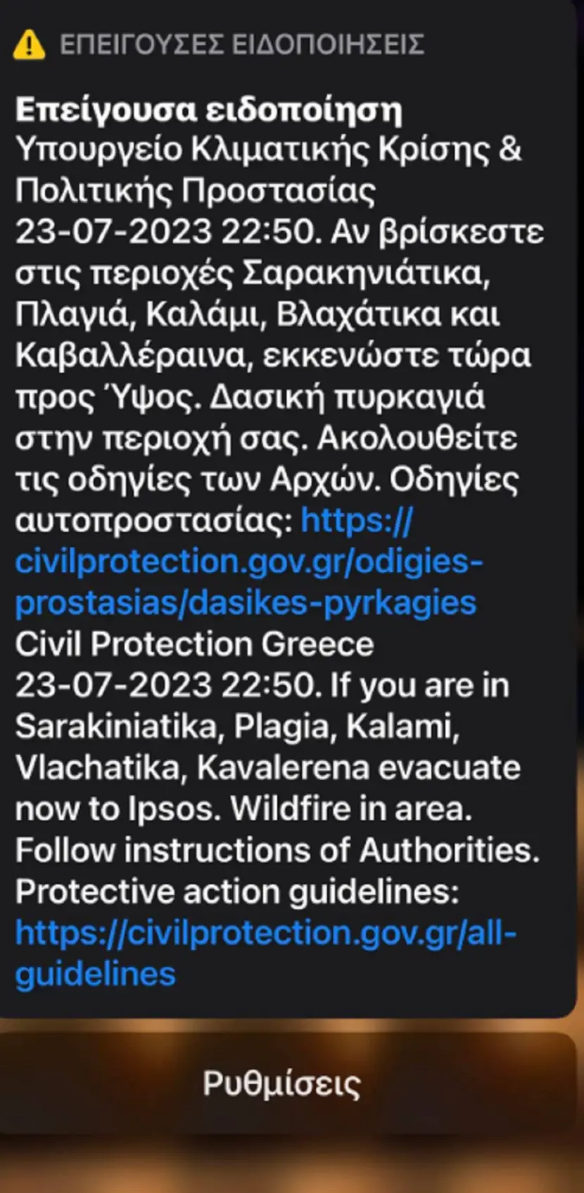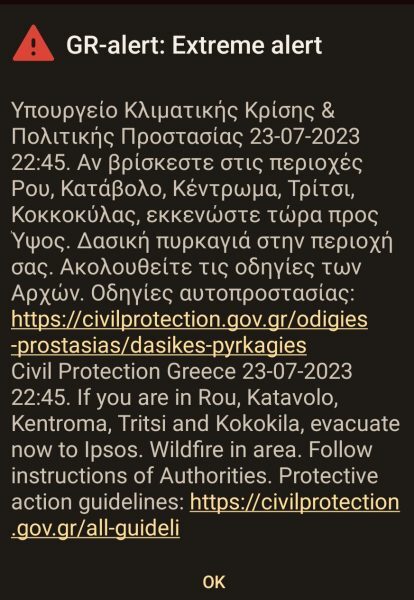 Νέο μήνυμα του 112 ήχησε στους κατοίκους της Κέρκυρας. «Αν βρίσκεστε στις περιοχές Ρου, Κατάβολο, Κέντρωμα, Τρίτσι, Κοκκοκύλας, εκκενώστε τώρα προς Ύψος», αναφέρεται στο μήνυμα.
