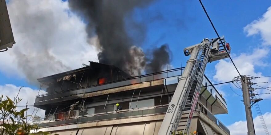 Δυο άνθρωποι έχουν αποκλειστεί στην ταράτσα, ενώ δυο όροφοι καίγονται ολοσχερώς.
