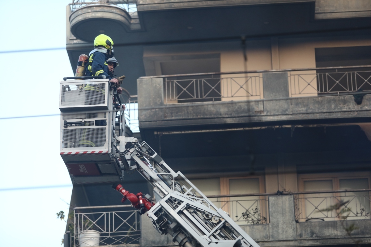 Το γερανοφόρο όχημα έριχνε νερό στους πάνω ορόφους του καταστήματος, καθώς σε κάποια διαμερίσματα των άλλων 4 ορόφων εκδηλώθηκε πυρκαγιά. Η φωτιά φέρεται να ξεκίνησε από το κατάστημα εστίασης και να επεκτάθηκε.