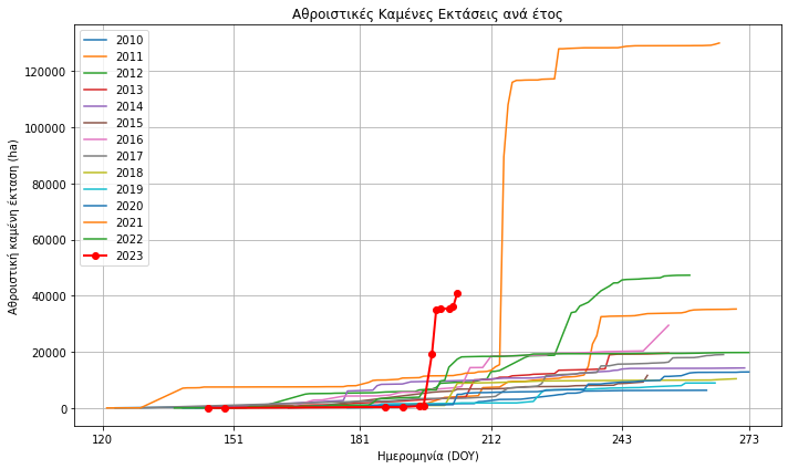 Με βάση τα δεδομένα που έχουν συλλεχθεί από το FireHUB και το Ευρωπαϊκό Σύστημα Πληροφοριών για Δασικές Πυρκαγιές (EFFIS), φαίνεται πως βρισκόμαστε σε μία πολύ δύσκολη χρονιά όσον αφορά στις δασικές πυρκαγιές. Μελετώντας τις συνολικές καμένες εκτάσεις στη χώρα μας, την περίοδο 2010 έως 2023, προέκυψε ότι οι δασικές πυρκαγιές των τελευταίων δύο εβδομάδων έχουν προκαλέσει σημαντική αύξηση στις καμένες εκτάσεις, σημειώνοντας τα υψηλότερα επίπεδα που έχουν καταγραφεί στα τέλη Ιουλίου, τα τελευταία 13 χρόνια.