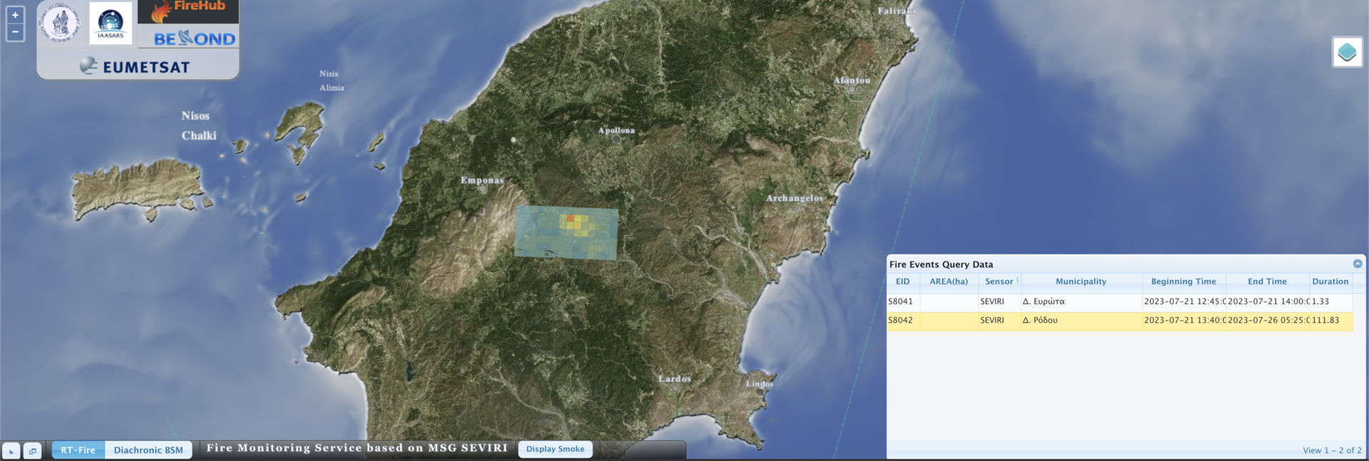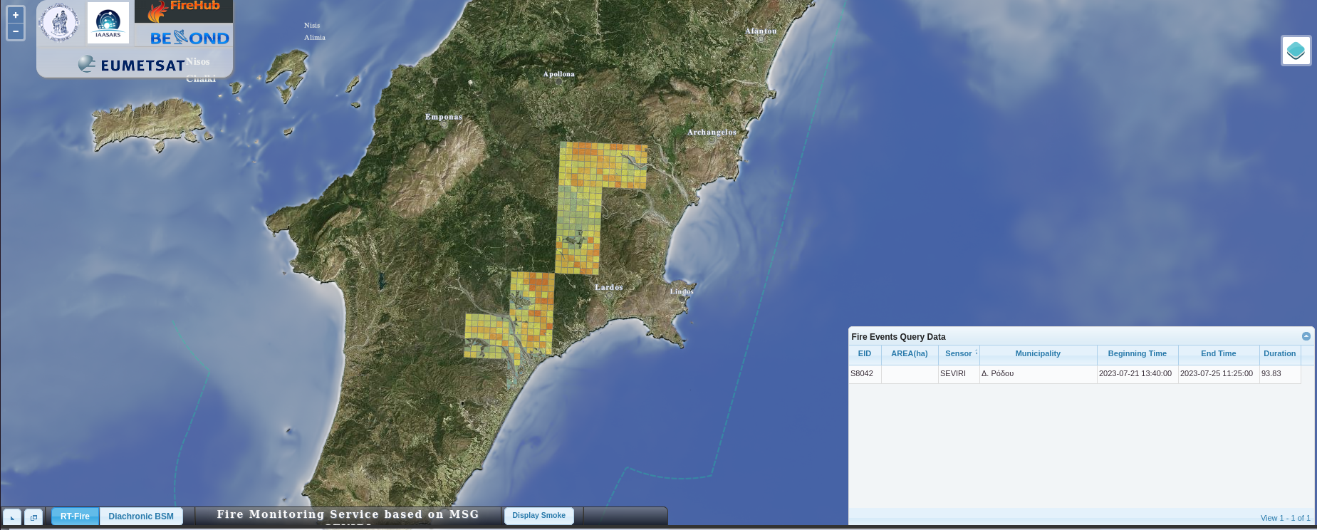 Στις 21:00 τοπική ώρα η εικόνα της διασποράς του καπνού από τις τρεις (3) αυτές φωτιές είναι χαρακτηριστική, ενώ φαίνεται ότι μεταφέρεται μεγάλος όγκος μικροσωματιδίων προς νοτιοδυτικά. Στις 18/07 και ώρα 19:11 καταγράφηκε η έναρξη της δασικής πυρκαγιάς στην περιοχή ‘Εμπωνας της Ρόδου, ενώ στις 23/07 ξέσπασε δασική πυρκαγιά στην Κέρκυρα. Και οι δύο (2) αυτές πυρκαγιές παραμένουν ενεργές μέχρι αυτήν την ώρα.