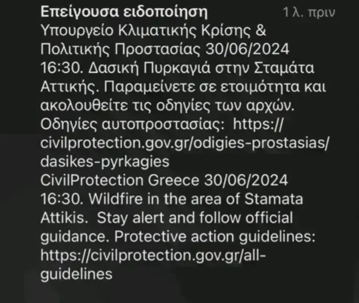 «Δασική πυρκαγιά στη Σταμάτα Αττικής. Παραμείνετε σε ετοιμότητα και ακολουθείτε τις οδηγίες των Αρχών», αναφέρει το μήνυμα του 112.