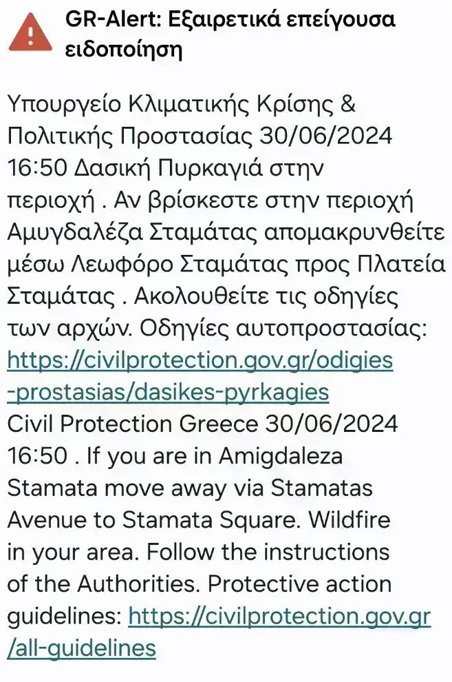 Στις 17:15 περίπου εστάλη νέο 112 στην περιοχή της Σταμάτας αναφέροντας «Αν βρίσκεστε στην περιοχή #Γαλήνη #Σταμάτας απομακρυνθείτε μέσω Λεωφόρου #Σταμάτας προς #Δροσιά ».