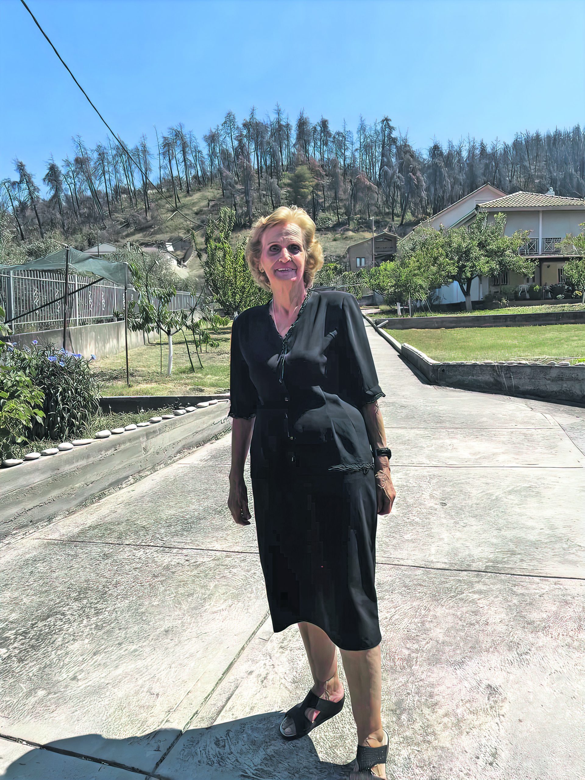Μοιραία, ο χρόνος γυρνά πίσω, στον Αύγουστο του 2021. Ηταν λίγες μέρες πριν, που η κυρία Γιούλα είχε αποχαιρετήσει για πάντα την αγαπημένη της αδελφή και ζούσε το δικό της πένθος. Βρισκόταν στο μπαλκόνι και παρακολουθούσε το πύρινο μέτωπο να «καταπίνει» με μανία το δάσος. «Ξαφνικά, από την άλλη πλευρά βλέπω να κατεβαίνει η φλόγα. Ο άντρας μου μαζί με τους γείτονες έριχναν νερό για να σώσουν ό,τι μπορούσαν. Ετρεξα προς την έξοδο και ένιωθα τη φωτιά να με ακολουθεί».