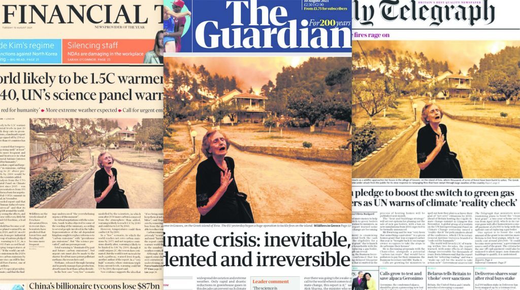 «Τυλιγμένο στις φλόγες: Η ελληνική νήσος Εύβοια καταστρέφεται από ακραίο καιρικό φαινόμενο» ήταν ο τίτλος στο πρωτοσέλιδο της «Daily Mail» με τη φωτογραφία της «κραυγής». «Κλιματική κρίση: Αναπόφευκτο, πρωτοφανές και ανεπανόρθωτο» έγραψε η «Guardian».