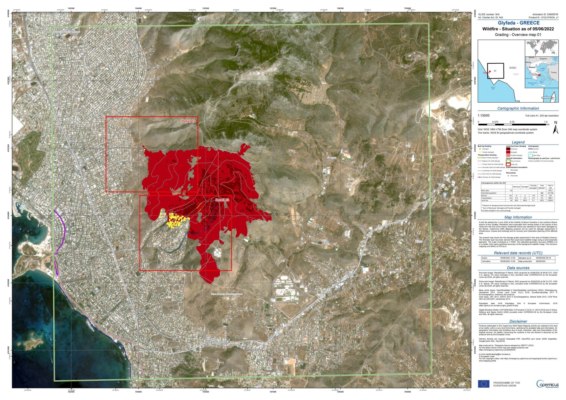 Στον χάρτη της Υπηρεσίας Copernicus αποτυπώνεται με λεπτομέρειες η έκταση που κάηκε, καθώς και κτίρια που πιθανώς έχουν πληγεί μέσα στον αστικό ιστό στην ‘Ανω Βούλα, κάτι που όμως δεν είναι αξιόπιστο, καθώς η φωτογραφία είναι από πάνω, γι’ αυτό γίνεται καταμέτρηση των ζημιών δρόμο- δρόμο, από την Πυροσβεστική, τον δήμο και την Περιφέρεια, ώστε να αποζημιωθούν οι πληγέντες.