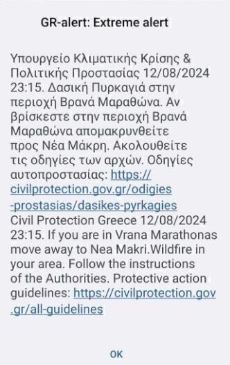 Πιο συγκεκριμένα, μόλις λίγα λεπτά νωρίτερα «ήχησε» για ακόμη μια φορά το 112 της Πολιτικής Προστασίας για εκκένωση. Απευθυνόταν στους κατοίκους Βρανά Μαραθώνα και το μήνυμα έγραφε χαρακτηριστικά: «Απομακρυνθείτε προς Νέα Μάκρη».