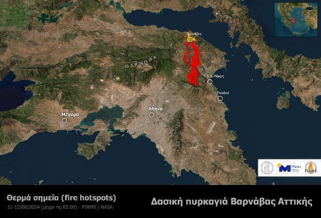 Η εξάπλωση των θερμών σημείων από την περιοχή του Βαρνάβα έως [περιγραφεί που έχει φτάσει νότια..] αποκαλύπτει την μεγάλη εξάπλωση της δασικής πυρκαγιάς, η οποία καθοδηγείτι κύρια από τους βόρειους/βορειοανατολικούς ανέμους και την την μεγάλη ξηρότητας τη βλάστησης που επιταχύνει τη διάδοση της φωτιάς, ενισχύει το θερμικό της φορτίο (ειδικά σε περιοχές όπου η διαθέσιμη προς καύση βλάστηση είναι υψηλή) και συνεισφέρει στην εκδήλωση πυκνών κηλιδώσεων (παραγωγή καυτρών, μεταφορά τους από τον άνεμο, εναπόθεση σε άκαυτη βλάστηση και έναρξη νέων εστιών).