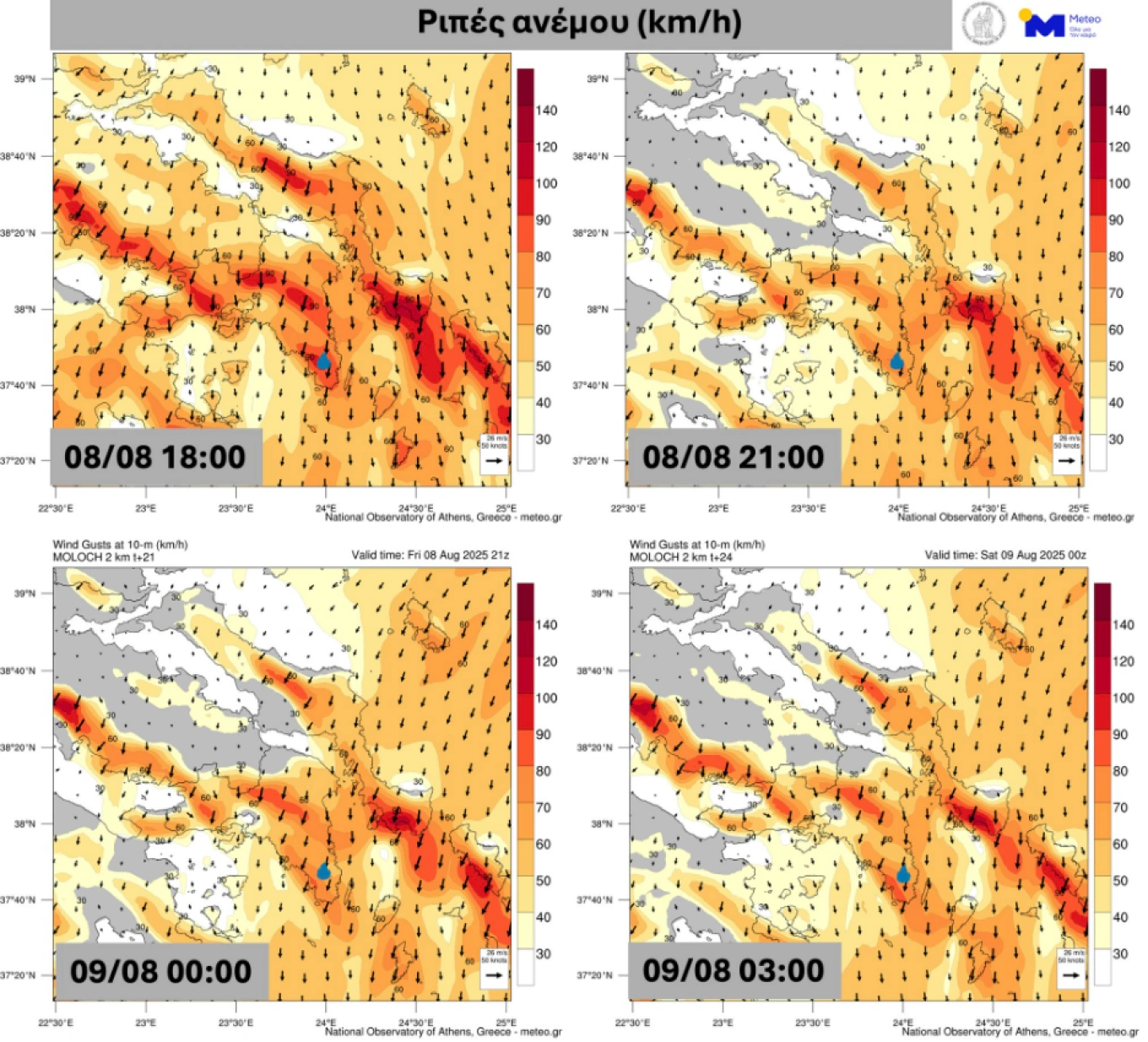 Στην παρακάτω ομάδα χαρτών παρουσιάζονται οι ριπές του ανέμου σε χιλιόμετρα ανά ώρα στις 18:00, και στις 21:00 της Παρασκευής 8 Αυγούστου 2025, αλλά και στις 00:00 και στις 03:00 του Σαββάτου 9 Αυγούστου 2025.