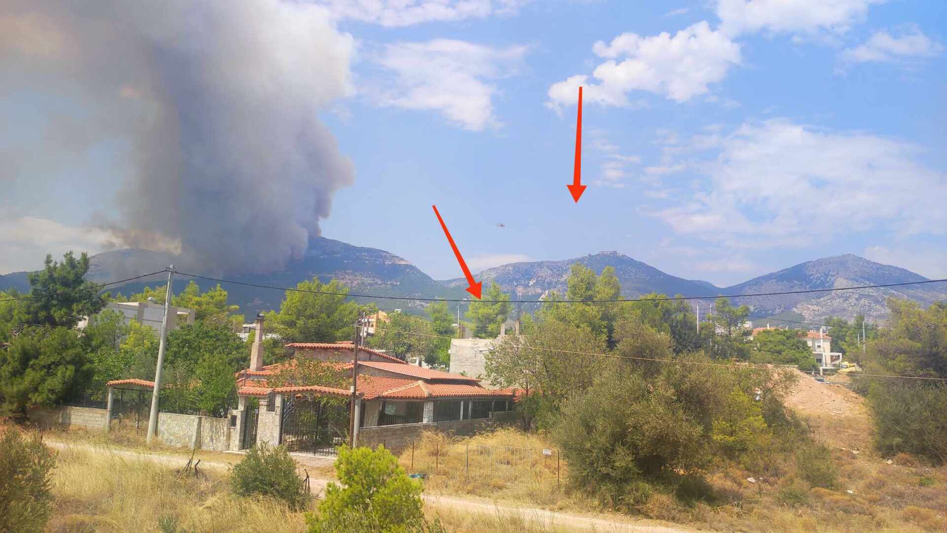 Μάχη δίνουν οι πυροσβεστικές δυνάμεις και οι εθελοντές για να σωθούν τα σπίτια και στην περιοχή του Αγίου Ιωάννη Ρώσου, στο Μενίδι.